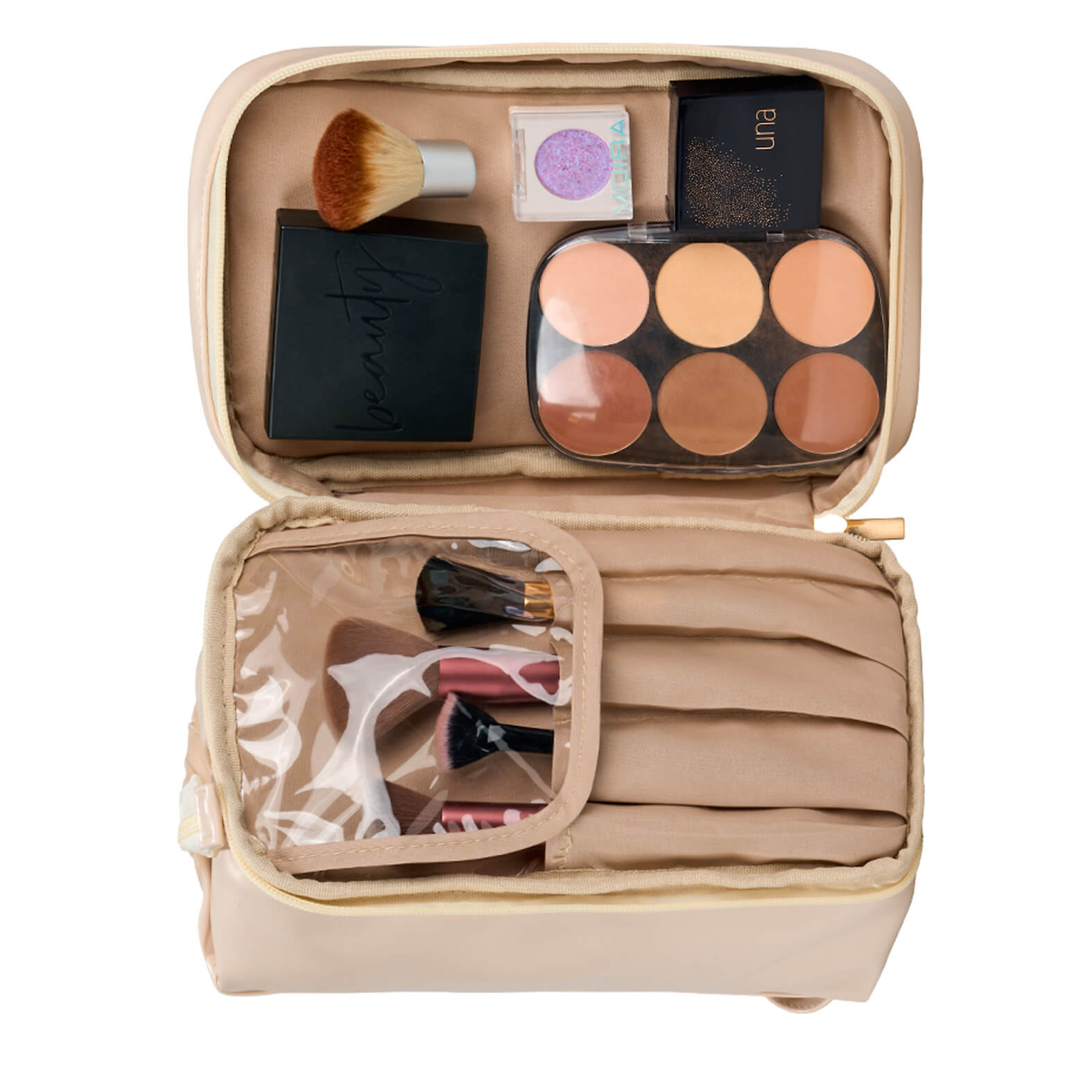 KHUN Cosmetiquera de dos niveles con interior forrado. Cuenta con organizadores internos para mantener los artículos en su lugar y un compartimento inferior con espacio específico para brochas. Ambas secciones incluyen cierre para mayor seguridad y comodidad.