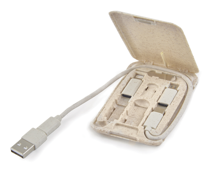 PEGASSO - Estuche portátil de fibra de trigo con apertura y cierre magnético que incluye: Cable extensión doble entrada tipo C para carga de dispositivos, adaptador universal, adaptador USB, adaptador para iPhone, espacio para tarjeta NANO SIM y PIN de expulsion. Además el estuche funciona como soporte para celular (posición horizontal). (Sujeto a compatibilidad a equipos telefónicos).