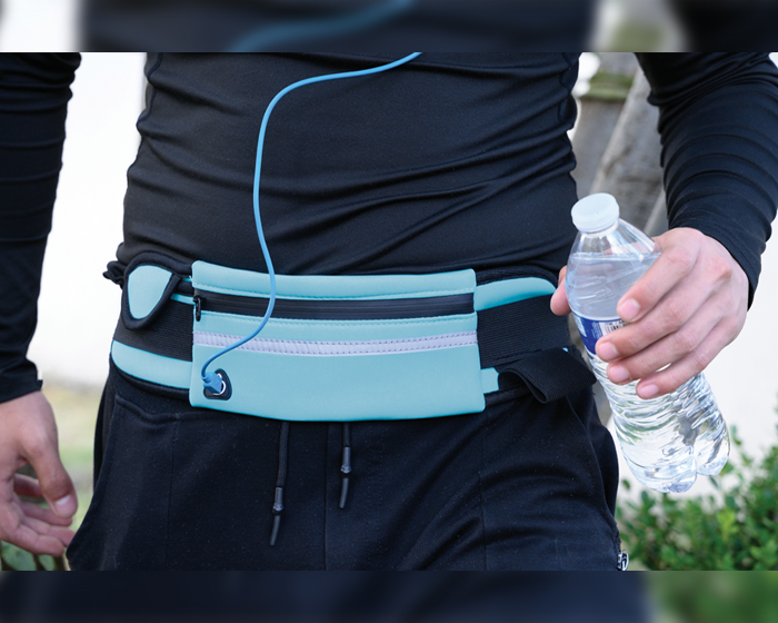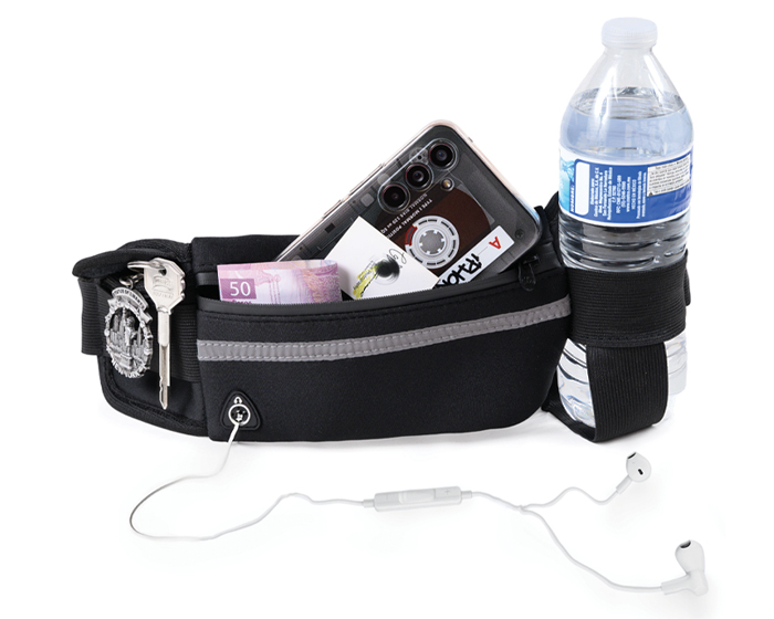 ZUMBA - Cangurera con cinta de resorte ajustable y broche de seguridad. Cuenta con 2 compartimentos laterales, 1 para guardar accesorios con broche de contacto y otro de resorte para botellas. Compartimento interno con cierre, cinta reflejante y salida para audífonos de cable.