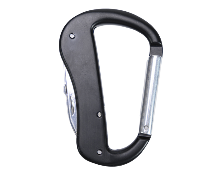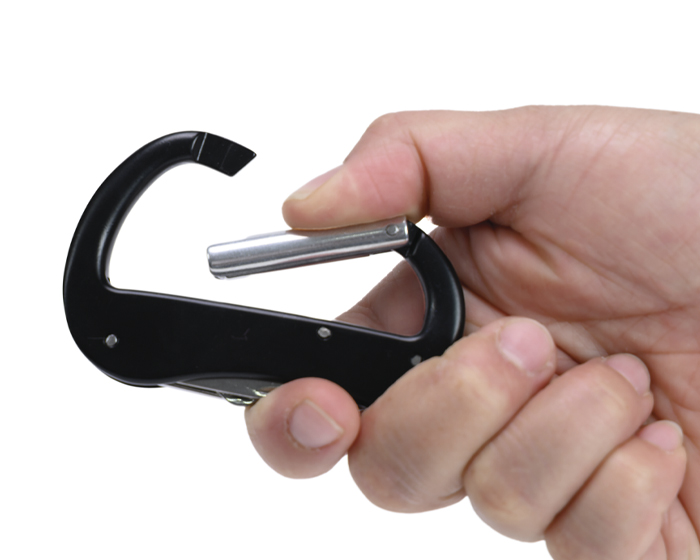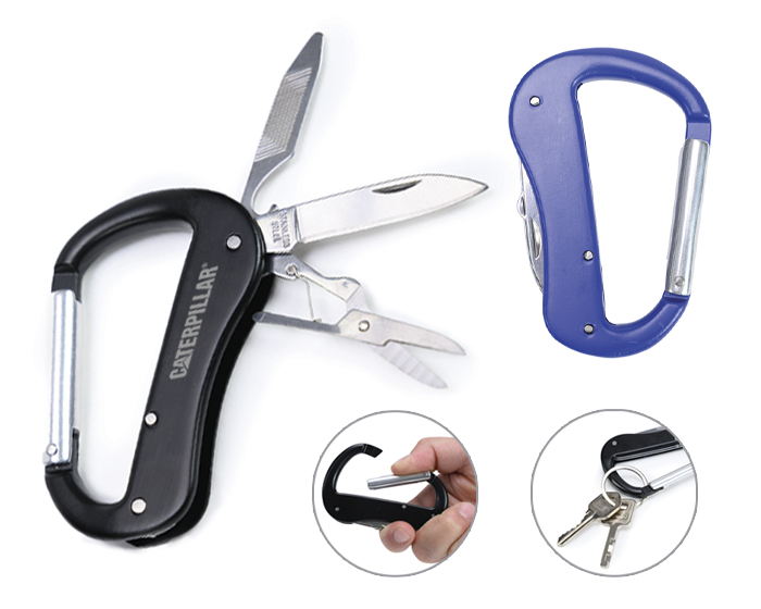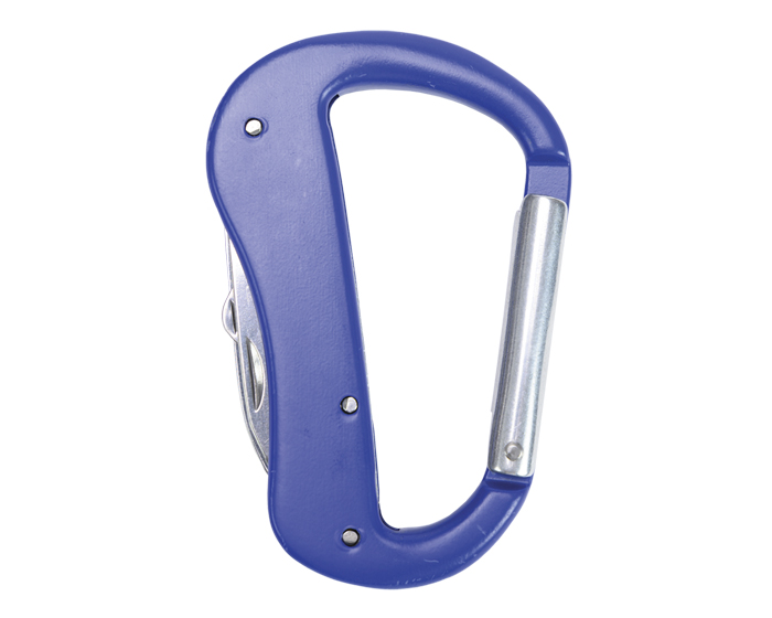 JERRY - Gancho con clip multifunción que incluye: tijeras, navaja y destapador con lima. Presentación: caja individual de kraft.