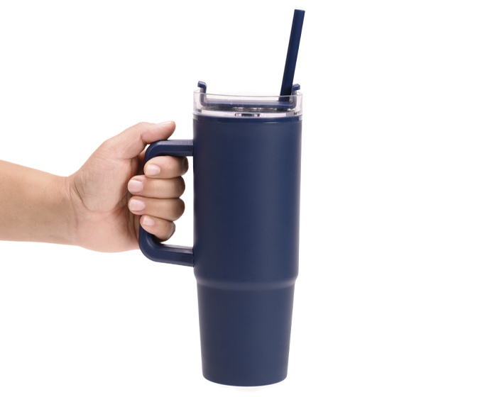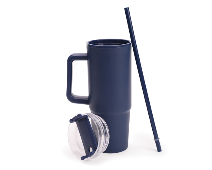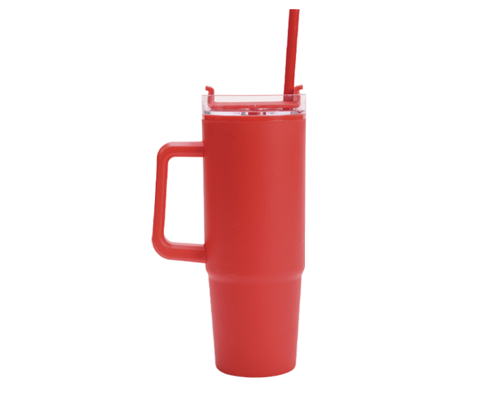 CARIBE - Termo de plástico de doble pared con asa. Cuenta con tapa transparente con cierre de rosca y sobre tapa giratoria en color del termo, con ranura para popote. Incluye popote de color. CAP. 770 ml.