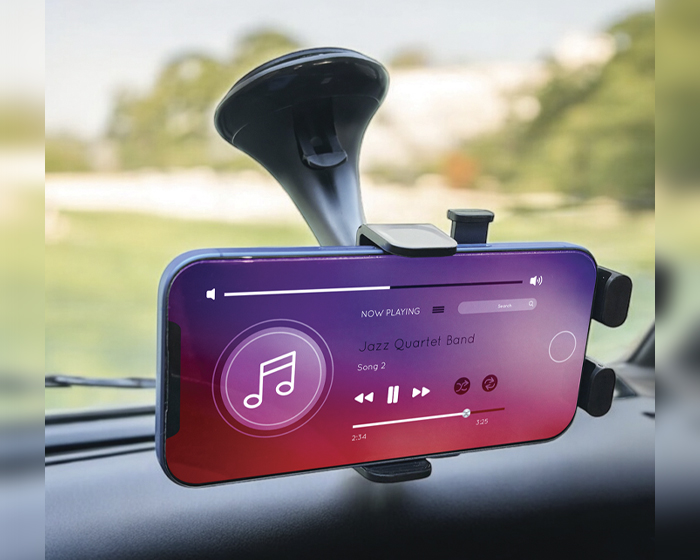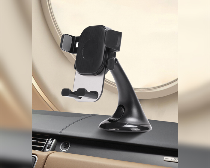 ROAD - Soporte para celular ajustable ideal para automóvil con cabezal de rotación 360°, cuenta con perilla para armar, rejillas ajustables con gomas antiderrapantes, abrazaderas y seguro de bloqueo con ventosa en la parte de la base para sujetar en tableros y parabrisas. Presentación: Caja en color blanco.