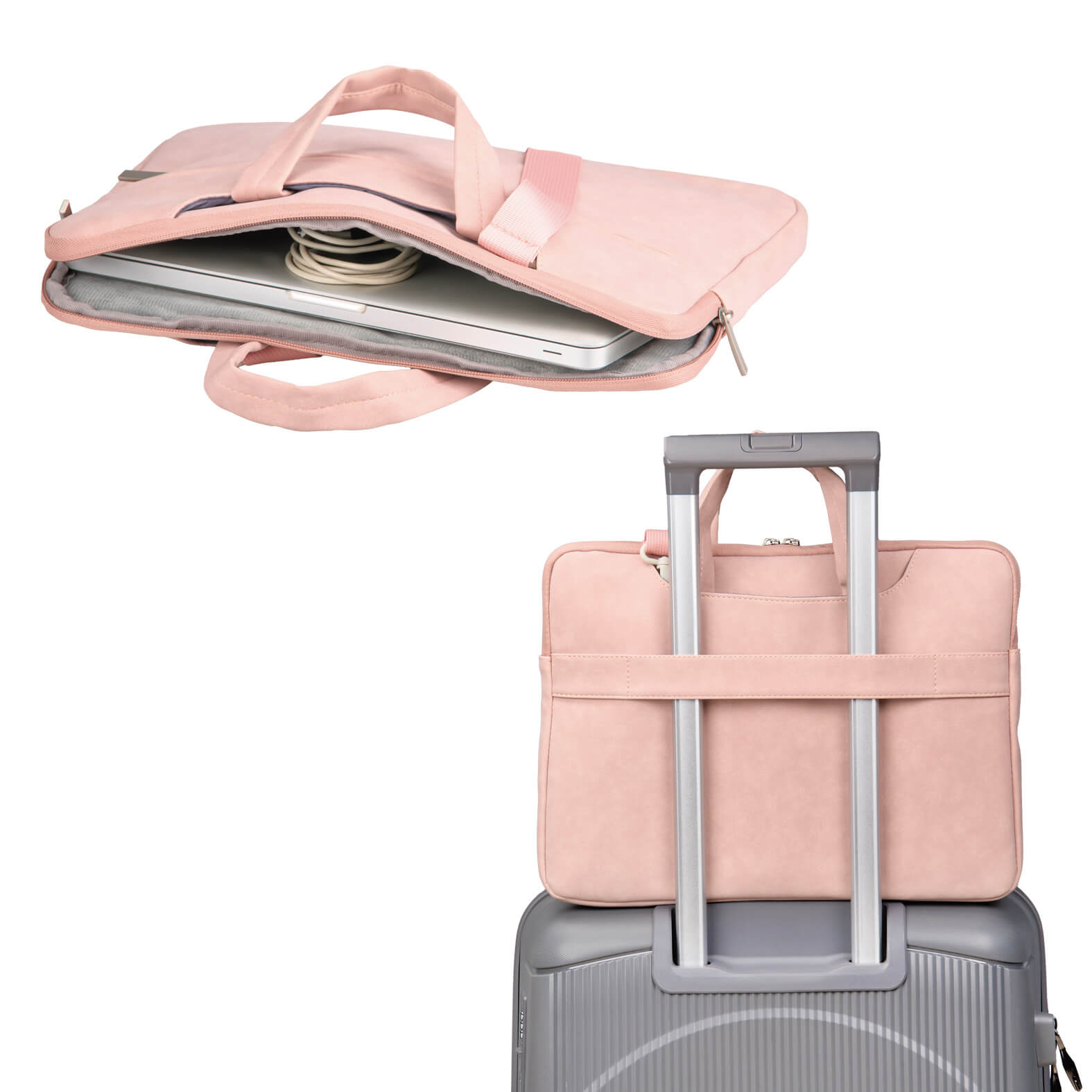 LEX Portafolio con compartimento principal afelpado para laptop de hasta 15", dos bolsillos para guardar las asas, bolsa frontal con cierre, banda carry-on y correa ajustable.
