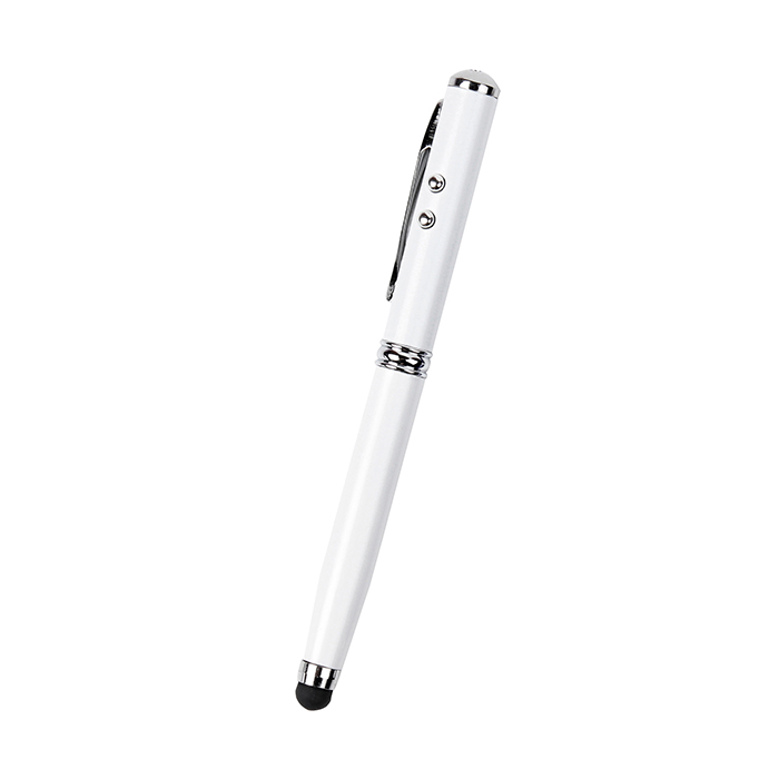 Bolígrafo metálico Montevideo. - Bolígrafo metálico con lámpara, señalador láser, puntero touch y detalles cromados. Incluye estuche de plástico con base para fijar bolígrafo, tapa trasparente con imán para cerrar. Tinta de escritura negra.
