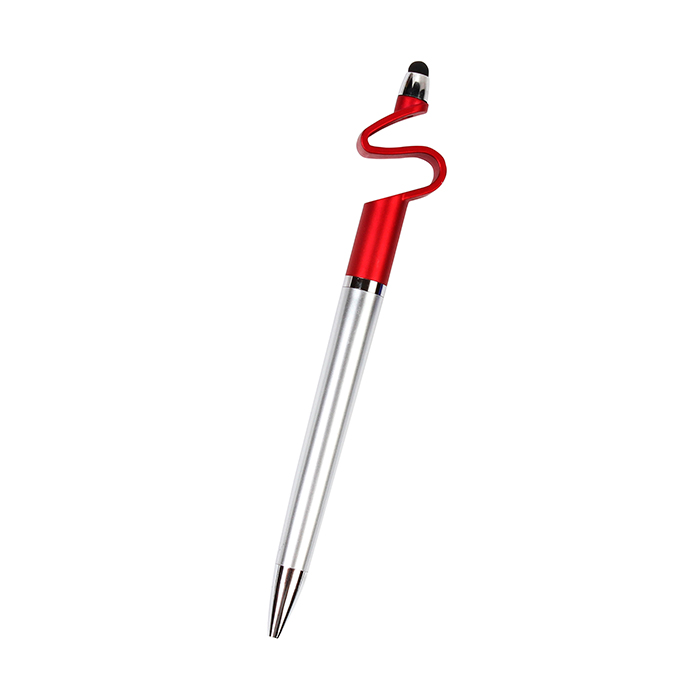 Bolígrafo de plástico Liverpool. - Bolígrafo de plástico con acabado metálico, puntero touch y base superior diseñada para sostener el celular. Tinta de escritura negra, combina funcionalidad y estilo.