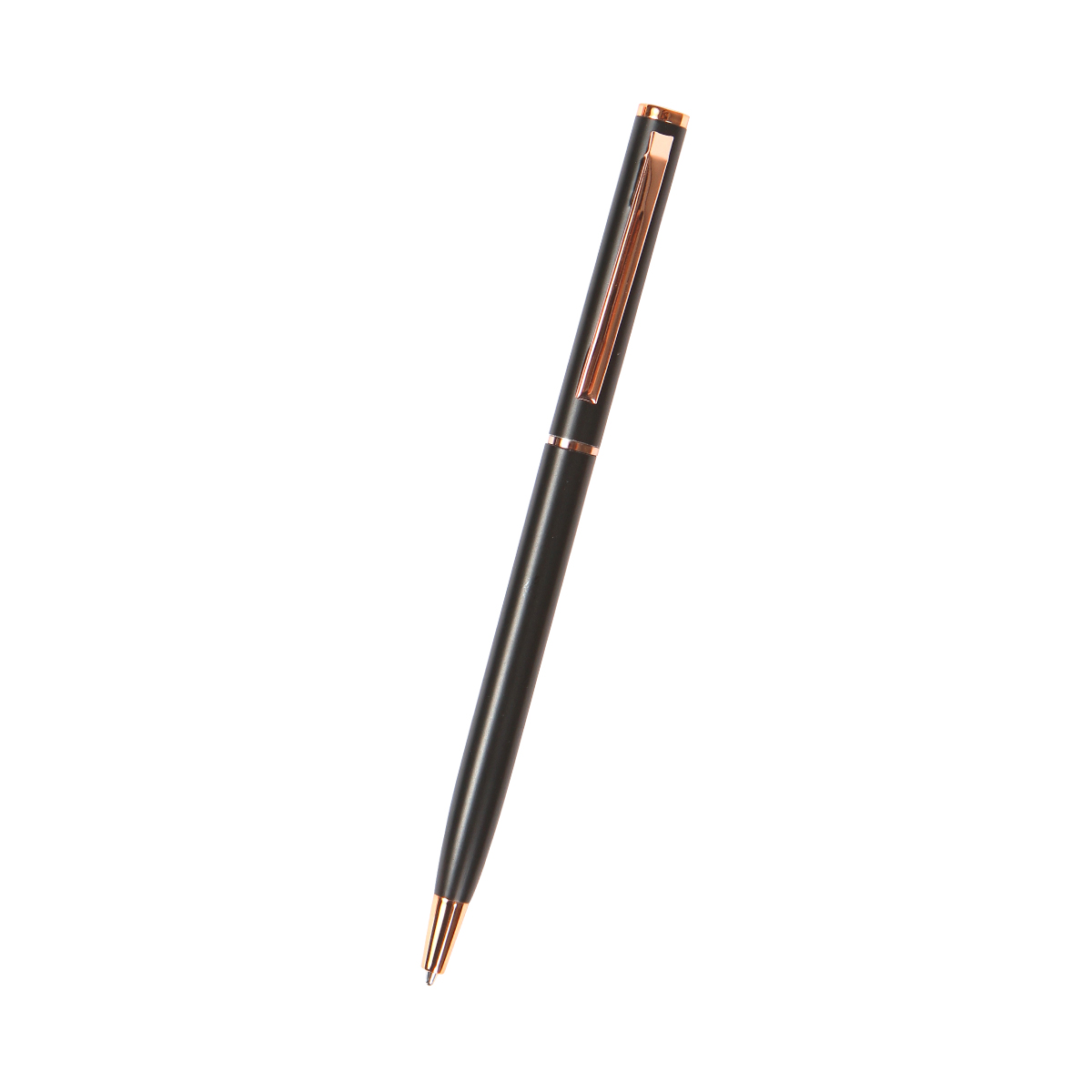 Bolígrafo Fontaneda. - Bolígrafo fabricado en aluminio con acción giratoria (twist). Barril de aluminio lacado. Clip, punta y aro medio de metal tipo oro rosa. Recarga cruzada de plástico. Tinta de escritura azul.