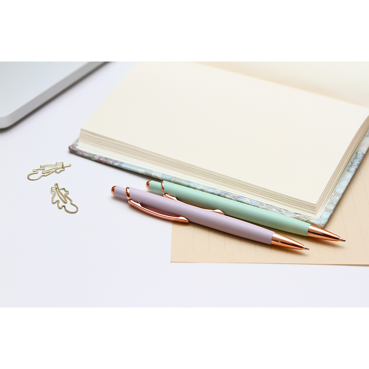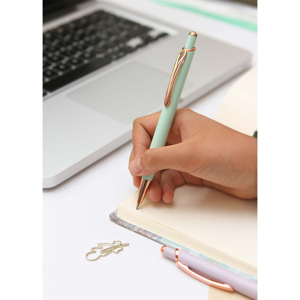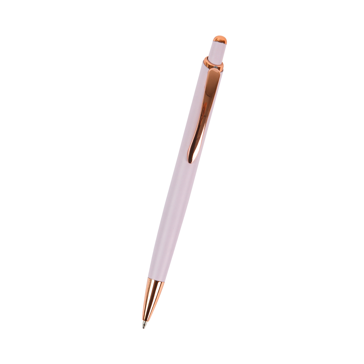 Bolígrafo Janzé. - Bolígrafo de acción de empuje con barril fabricado en aluminio acabado mate, con botón y clip de metal color rose gold. Tinta de escritura azul de 1.0 mm.