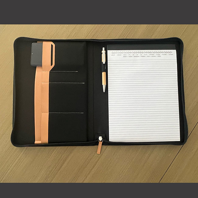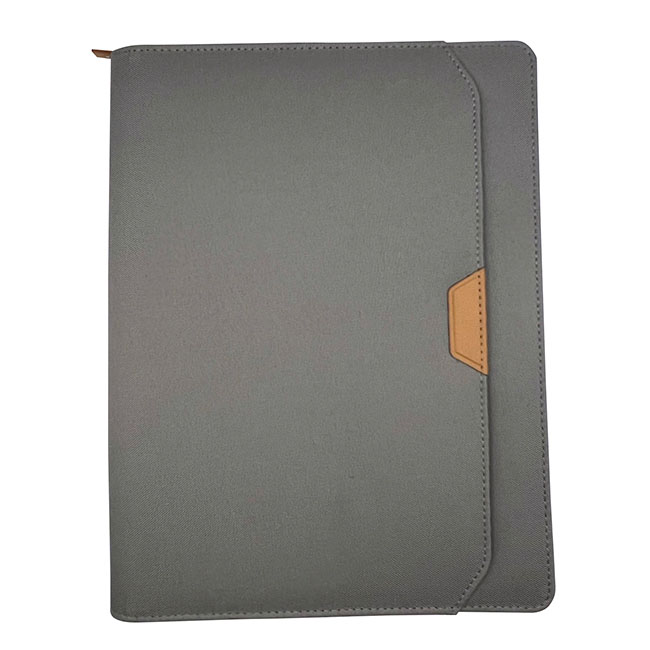 Porta Documentos Yakarta Porta Documentos Yakarta l Incluye block de hojas rayadas. l Interior con portabolígrafos y compartimentos organizadores l Cierre en zipper l Detalle de lengüeta al frente en curpiel l Colores: Gris y Negro. Material: PET reciclado Medida: 32 x 24 cm Impresión: Serigrafía Área de Impresión: 10 x 4 cm