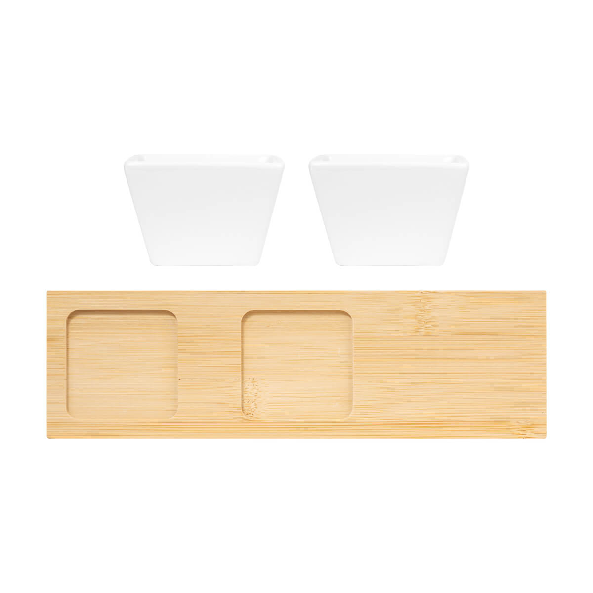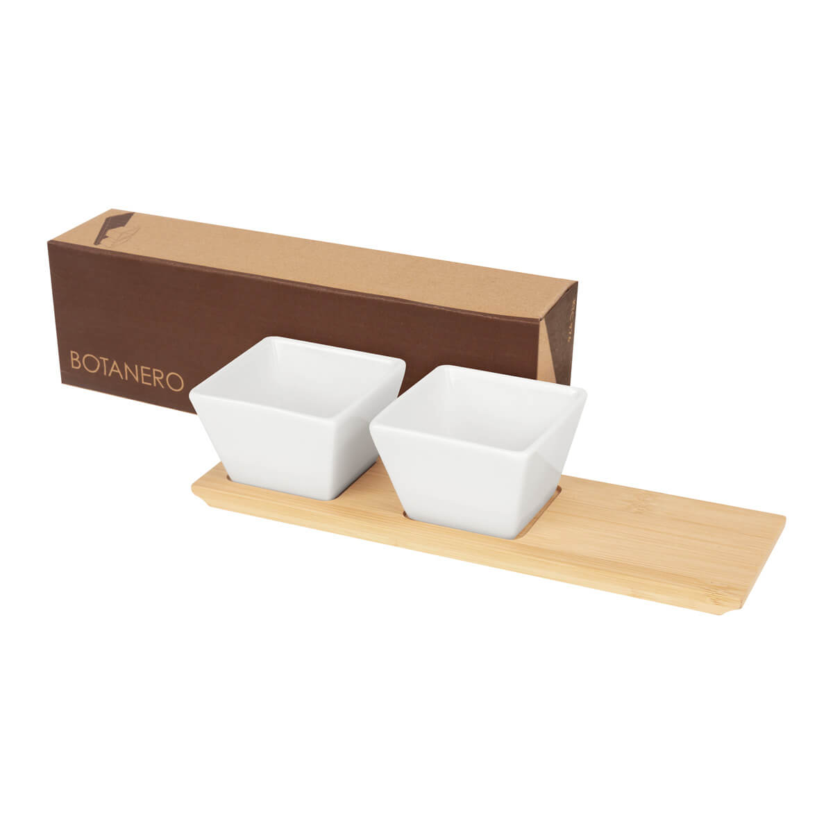 BOTANERO KIBI - Botanero con base de bambú y dos contenedores de cerámica. Perfectos para servir botanas, dips o salsas con estilo. Ideal para reuniones, cenas o cualquier ocasión donde el diseño y la practicidad se encuentren. Incluye caja individual. El bambú es un producto natural el cual puede presentar variaciones en tonalidades y vetas.
