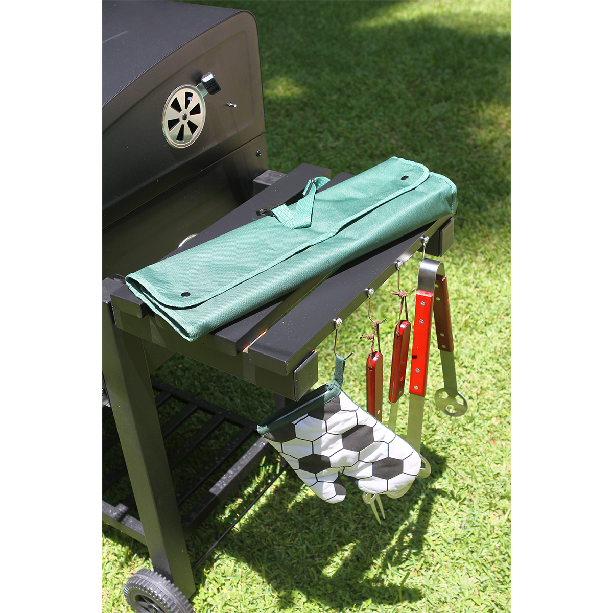 Juego de BBQ Roster. - Lleva tus asados al siguiente nivel con este completo juego de BBQ diseñado para los amantes de la parrilla. Fabricado con herramientas de acero inoxidable de alta calidad, que garantizan resistencia, durabilidad y fácil limpieza, y un mandil de poliéster con un diseño de cancha de fútbol que no pasará desapercibido, cómodo y práctico para proteger tu ropa mientras cocinas. Además, cuenta con bolsillos para guardar y transportar las herramientas de forma práctica y segura. El set incluye todo lo necesario para una experiencia de parrilla profesional y organizada: un tenedor, una espátula, una manopla resistente y pinzas, cada uno pensado para facilitar el manejo y control de tus alimentos. Ideal para asados en casa, picnics, campamentos o regalos especiales. Disfruta de una experiencia de barbacoa completa y sin complicaciones con este set profesional que combina calidad, funcionalidad y estilo. Combina tu amor por la parrilla y el fútbol. ¡Haz de cada asado una celebración!