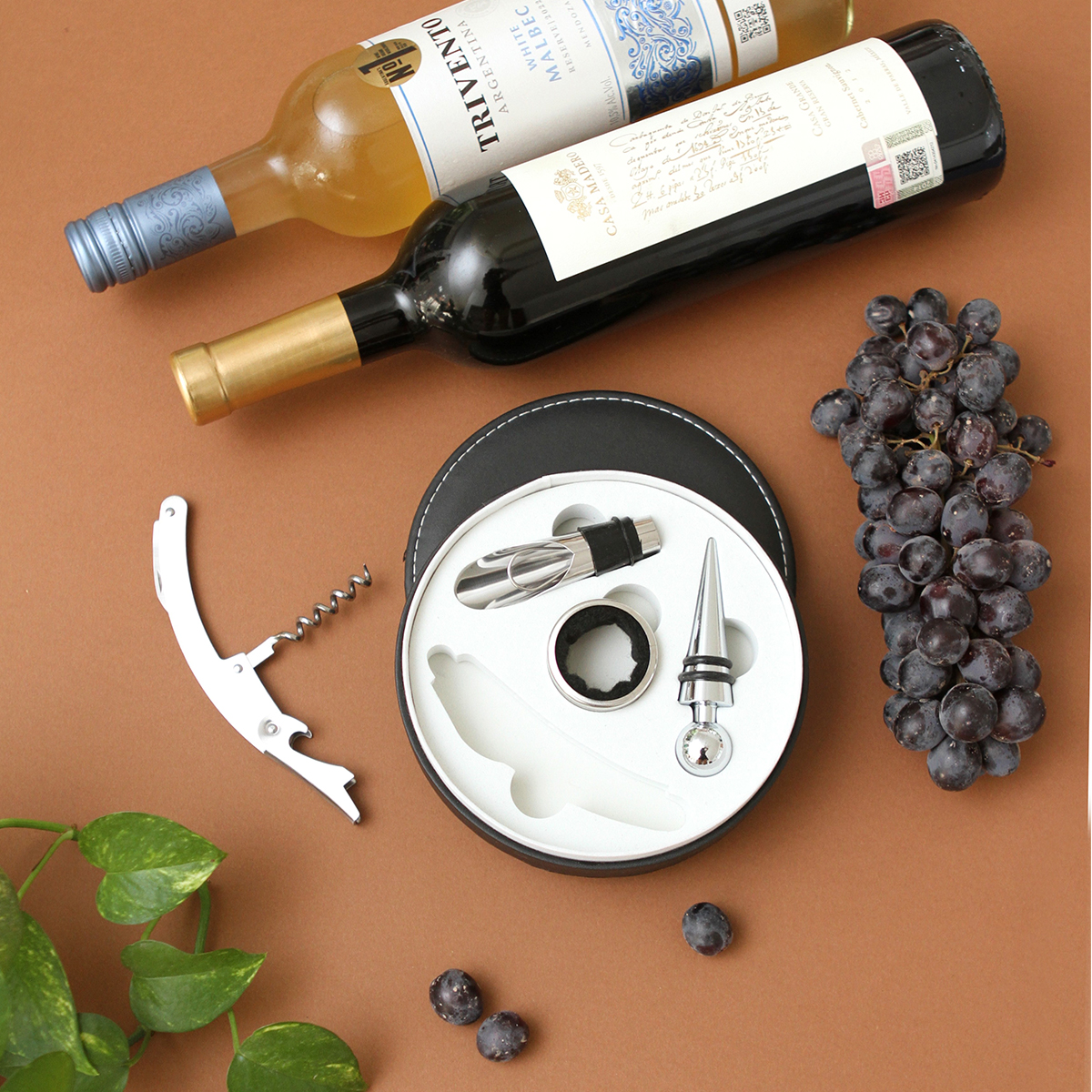 Set de vinos Multán. - Set de vino redondo con accesorios metálicos, el compañero perfecto para los amantes del vino. Este set completo y elegante incluye todos los elementos esenciales para disfrutar y servir el vino de manera sofisticada. Cuenta con sacacorchos, boquilla, corcho metálico y cortagotas, este set te brinda todas las herramientas necesarias para una experiencia de vino excepcional.