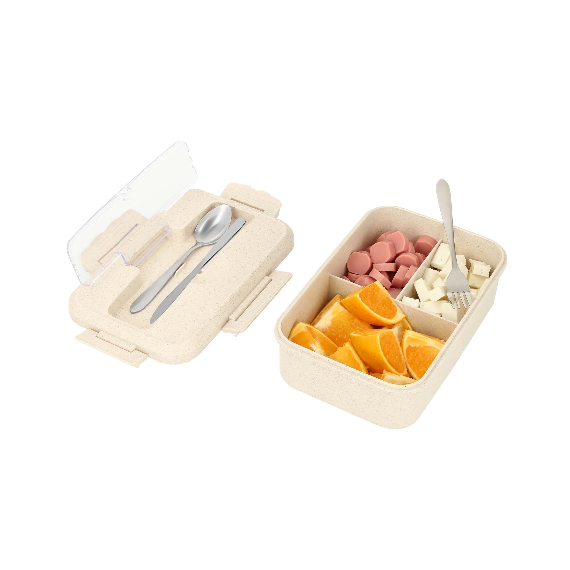 TOFU Contenedor para alimentos de wheat straw, con clips de seguridad, 3 compartimentos interiores, 1 compartimento superior transparente para cubiertos y soporte para celular. Incluye cuchara, tenedor y cuchillo de metal.
