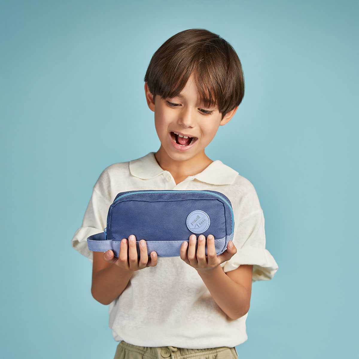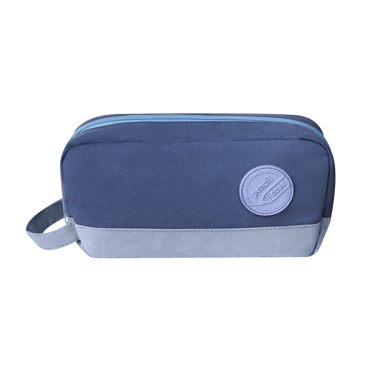 ESTUCHE ESCOLAR SKOLAI - Estuche escolar bitono con asa para sujetar fácilmente. Incluye cierre en el compartimento principal, amplio espacio para artículos escolares y un parche decorativo de silicón.
