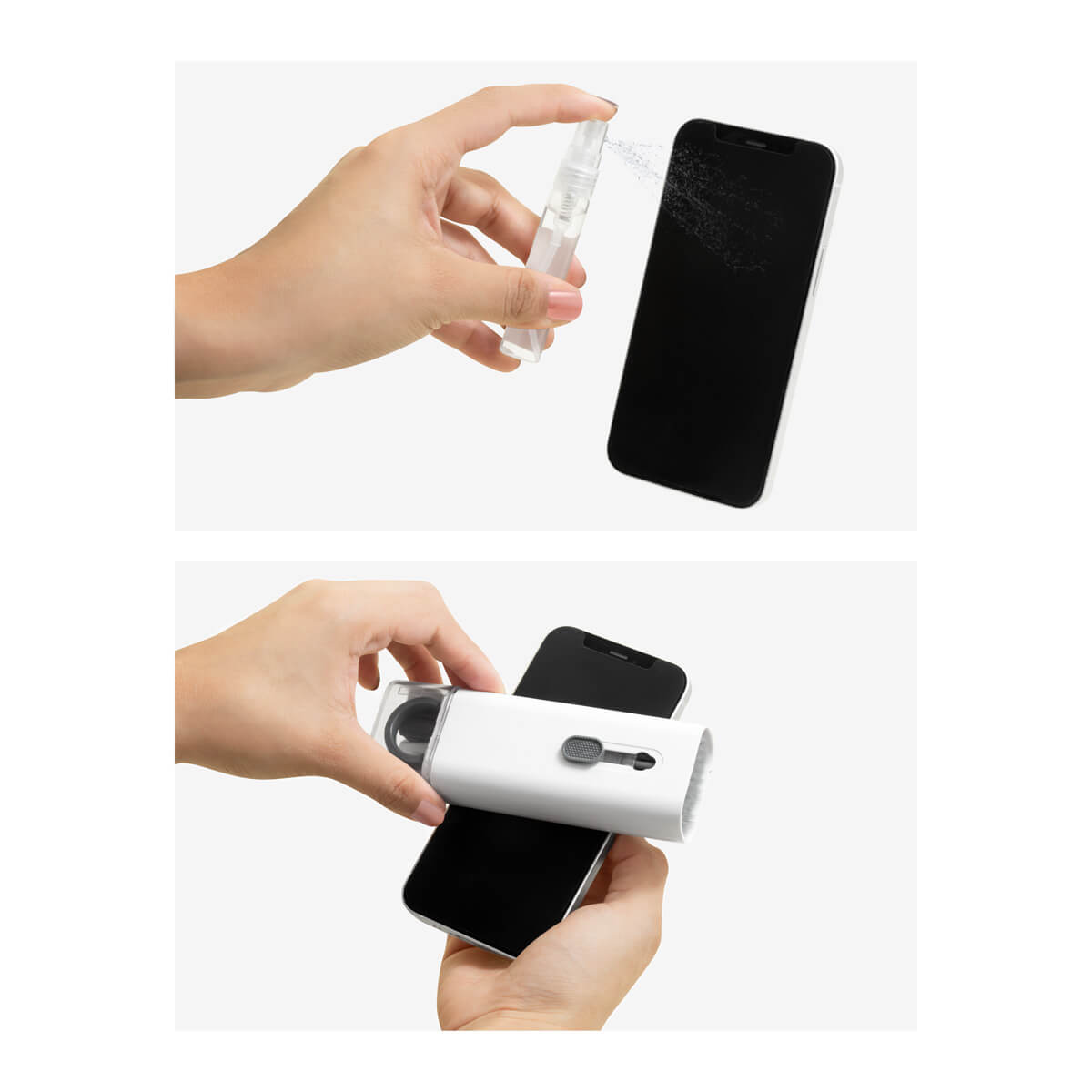 KIT DE LIMPIEZA MULTITOOL - Kit de limpieza para electrónicos, gadgets, celulares y más. Incluye 5 herramientas básicas para mantener tus accesorios favoritos libres de suciedad. Cepillo plegable 3 en 1 para limpiar aurículares. Equipado con punta de silicón, cepillo de esponja y mini cepillo. Mini atomizador de 5ml con líquido limpiador de pantallas. Removedor de teclas (para teclado mecánico). Cepillo retráctil para limpiar teclados o superficies planas. Limpiador de pantallas y caja individual.
