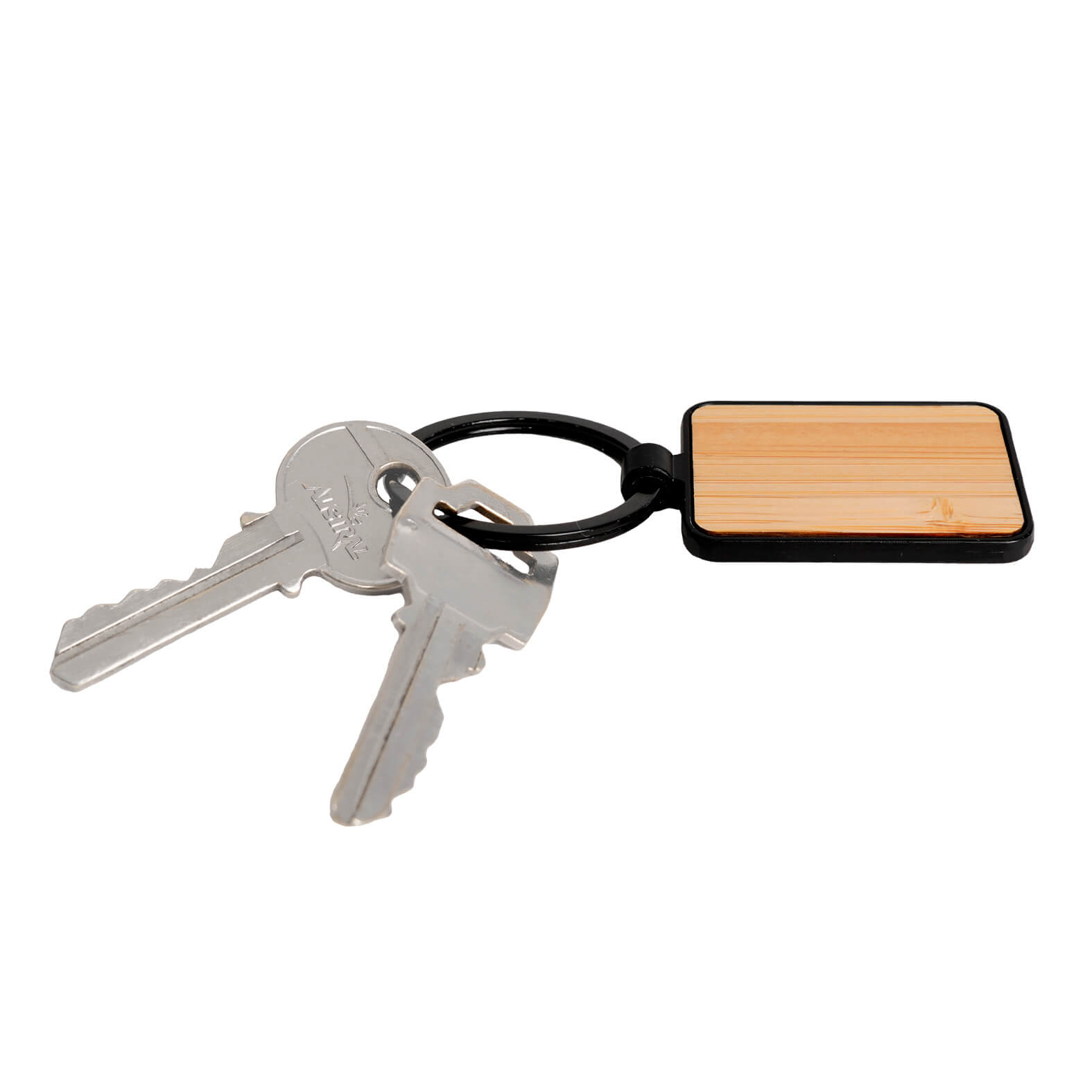 LEGNO Llavero rectangular metlaico con acabado de bambú y aro reforzado.