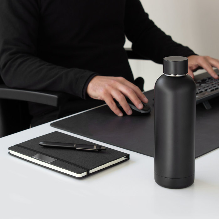- 1 botella térmica color negro mate de 7,4 x 22 cm. y 500 ml. Doble pared, sellada al vacío. Tecnología vacuum. Interior en acero inoxidable 304 y exterior en acero inoxidable 201. Tapa a rosca de acero con anillo de silicona.