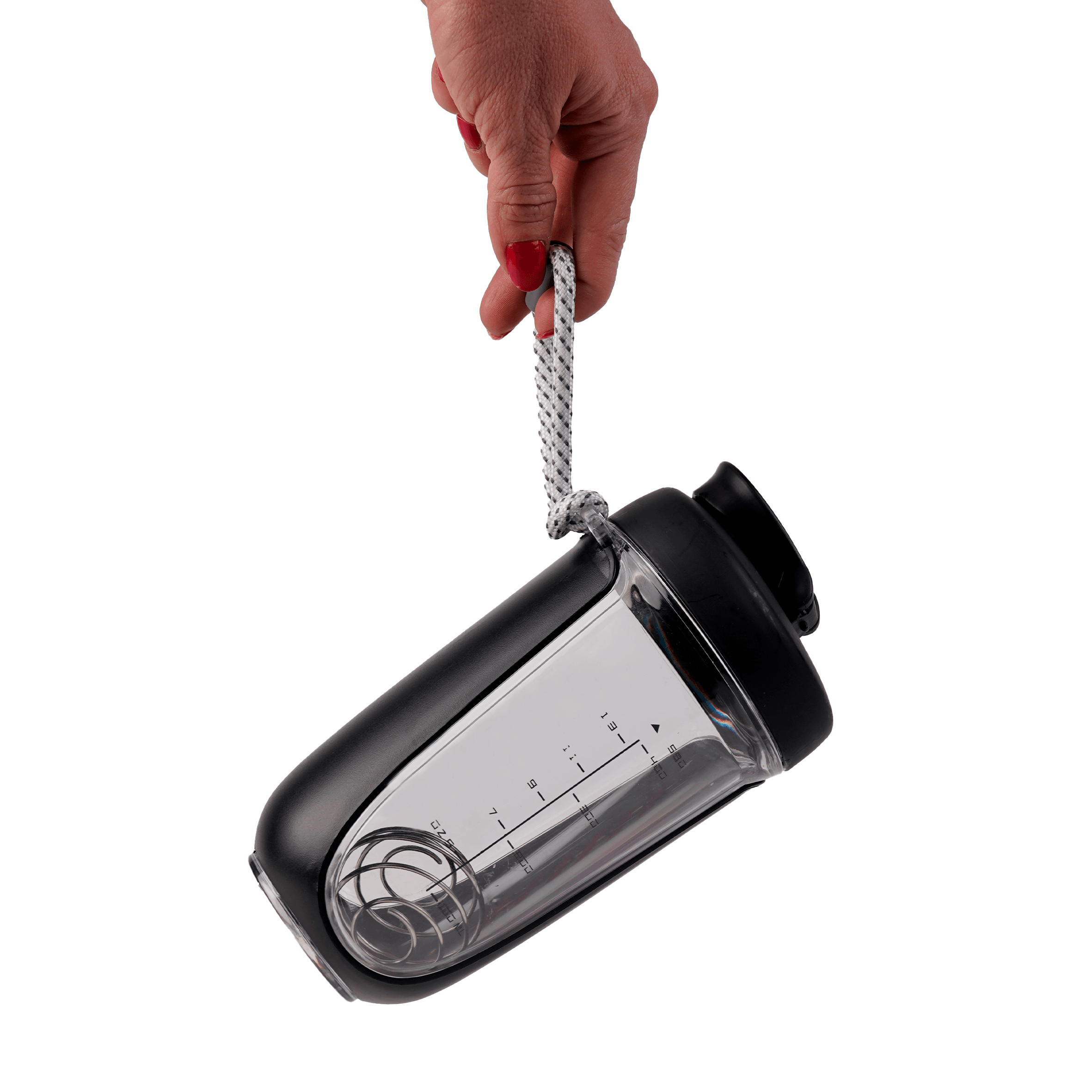 TURN Cilindro de plástico con resorte de acero, tapa enroscable y asa tipo cuerda.