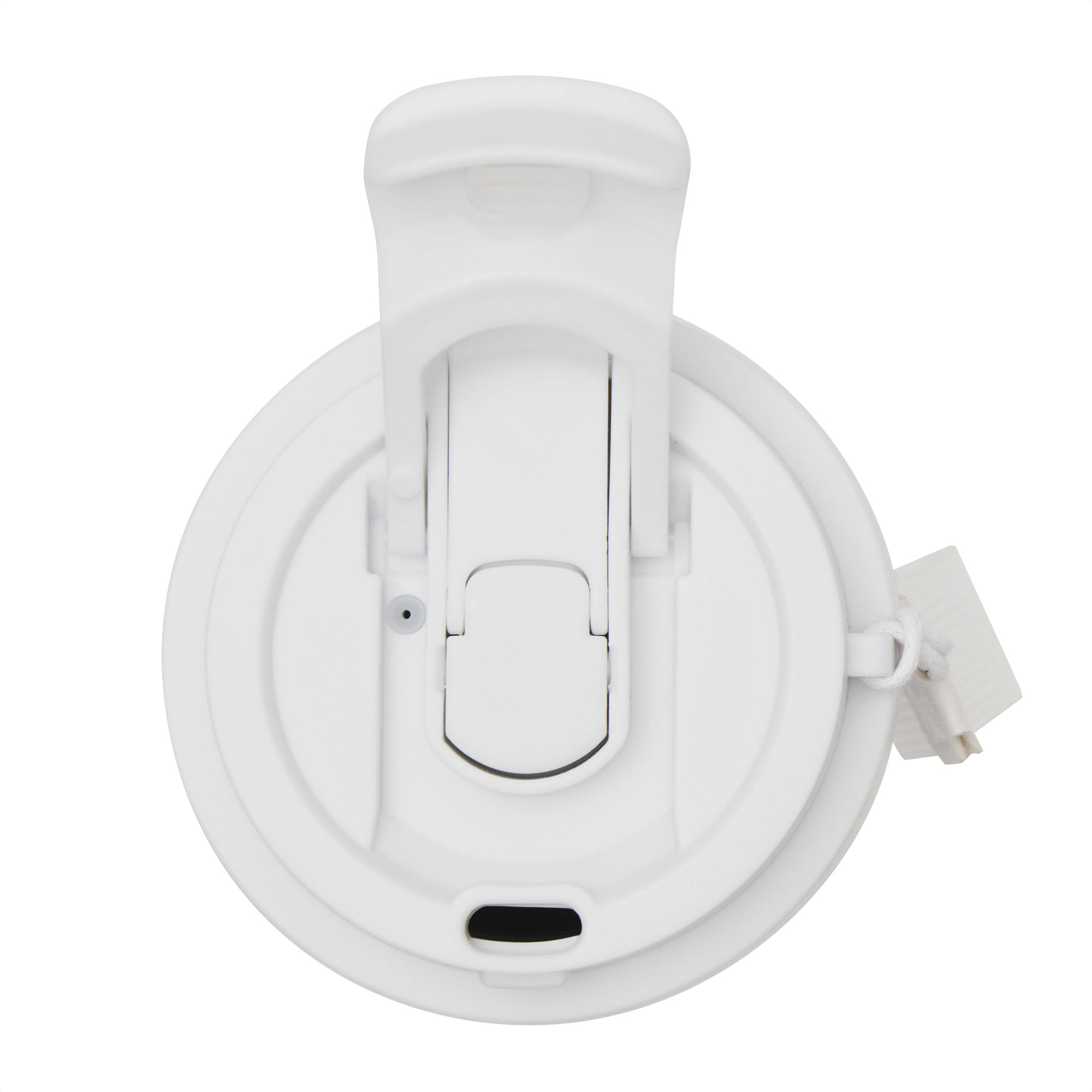 Mug térmico "LUNGO" Mug doble pared, sellado al vacío. Interior en acero 304 y exterior en acero 201. Tapa de polipropileno a rosca y anillo de silicona, 2 en 1, con popote de polietileno incorporado, seguro antiderrame a presión y correa de poliéster. Tapa y correa del mismo color que el vaso. Pintura con acabado mate, textura suave al tacto. Base en acero 201. Mantiene hasta 12 hs la temperatura de las bebidas calientes y 24 hs de las bebidas frías
