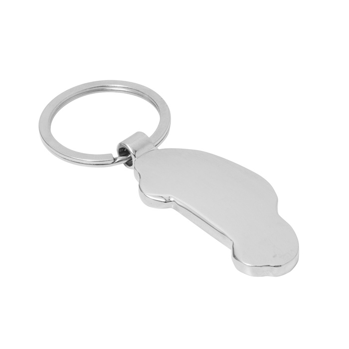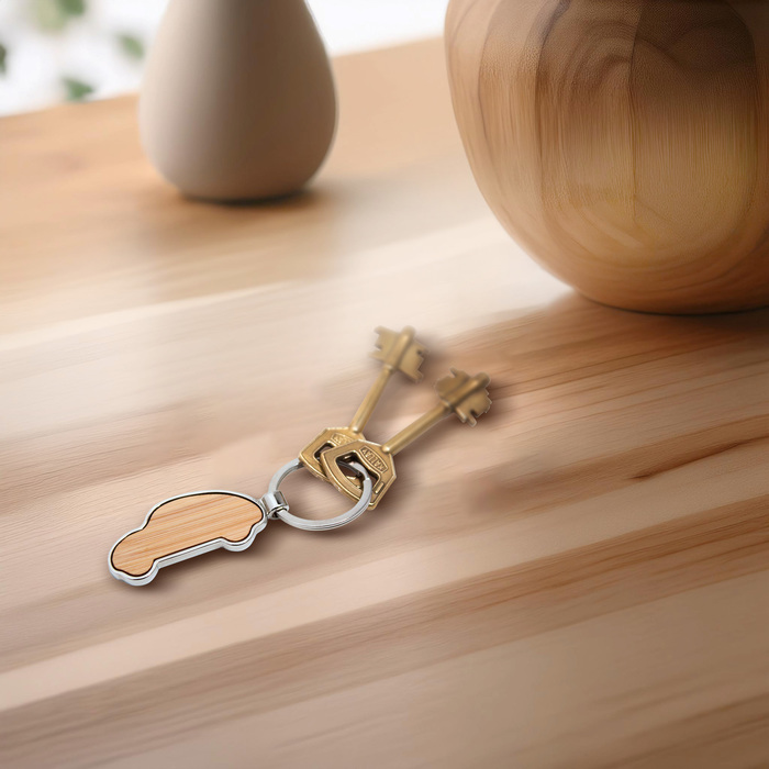 Llavero "KICAR" Llavero con forma de auto. Estructura metálica con aleación de zinc con acabado brillante y panel frontal de bambú barnizado.