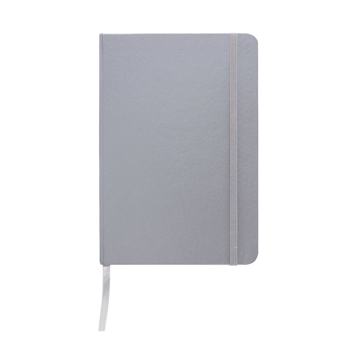 Libreta "MEDIUM" Tapa de cartón de 300g recubierta en poliuretano de diferentes colores. Interior de 80 hojas rayadas en papel obra crema de 70g. Encuadernación cosido. Incluye cinta señaladora del color de la tapa. Cierre con banda elástica del mismo color.
