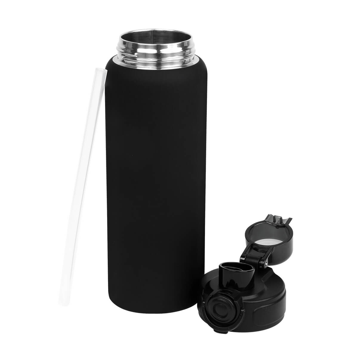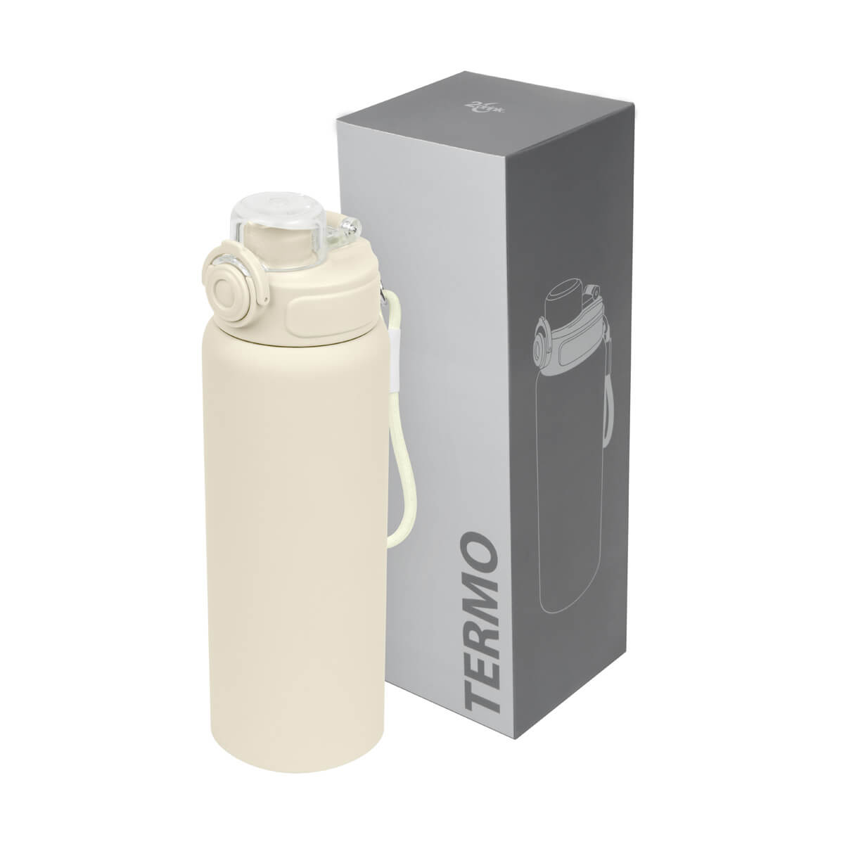 TERMO SARKAR - Termo doble pared. Cerrado al vacío. Pared interna y externa de acero inoxidable. Cuerpo con terminado tipo rubber, que lo hace suave al tacto. Tapa con cierre de rosca y sobre tapa tipo push para mantenerla seguro y limpio. Además con su nuevo diseño de boquilla, ofrece dos alternativas de uso, para beber normal o por medio de popote, ambas en la misma boquilla, sin ranuras adicionales. Mantiene temperatura caliente y fría por 8 hrs. Capacidad 27 Oz. Incluye asa de poliéster, popote de plástico y caja individual.
