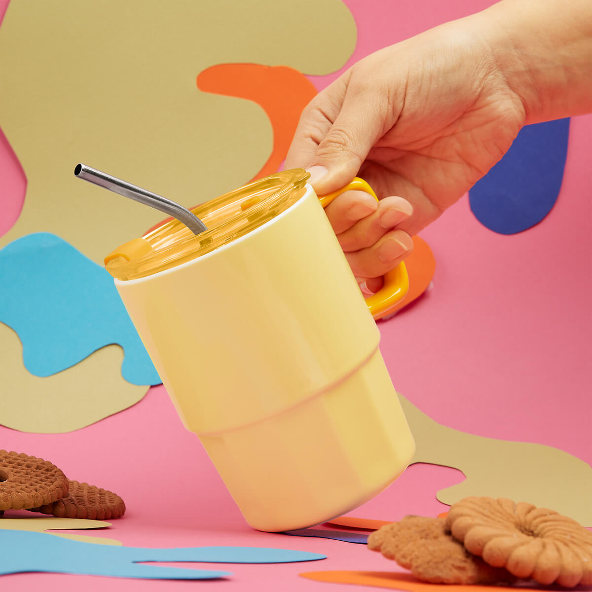 TAZA CORALINE - Taza de cerámica. Incluye tapa de plástico con sistema push, sobretapa deslizable y función adiconal para popote. Agrega también, un popote metálico reutilizable. Diseñada con colores vibrantes que alegran cualquier ocasión. Incluye caja individual de color.