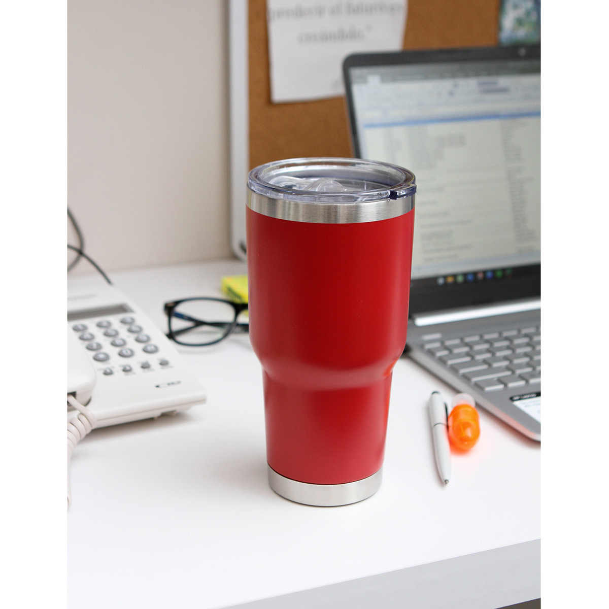 Termo Cirebon. - Termo de acero inoxidable doble pared acabado mate y detalles plateados en filo y base, con tapa deslizable de plástico transparente. Fabricado en materiales de grado alimenticio, mantiene bebidas frías o calientes por un largo tiempo. No usar en microondas. Capacidad de 850 ml. (29 oz) Incluye caja de cartón individual.