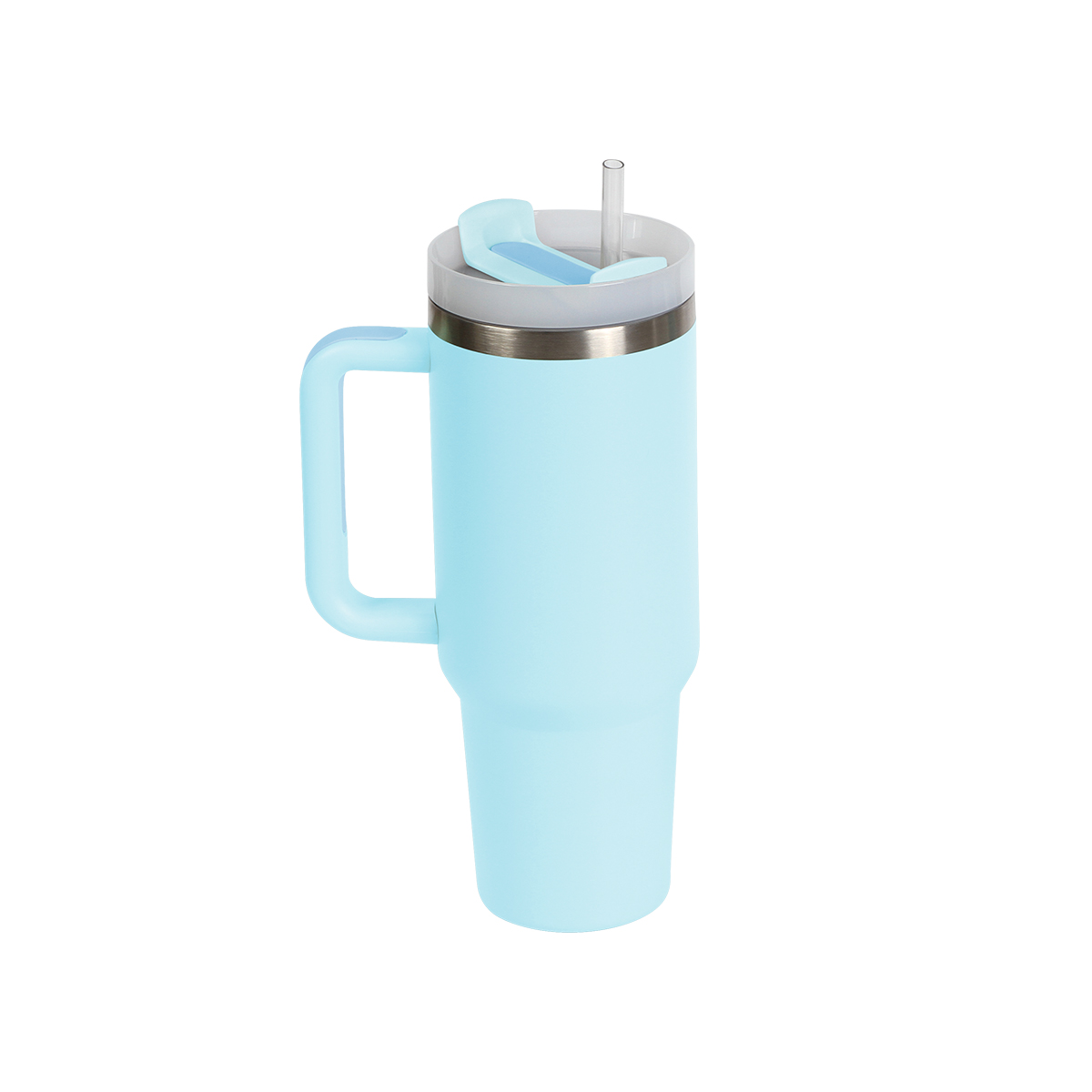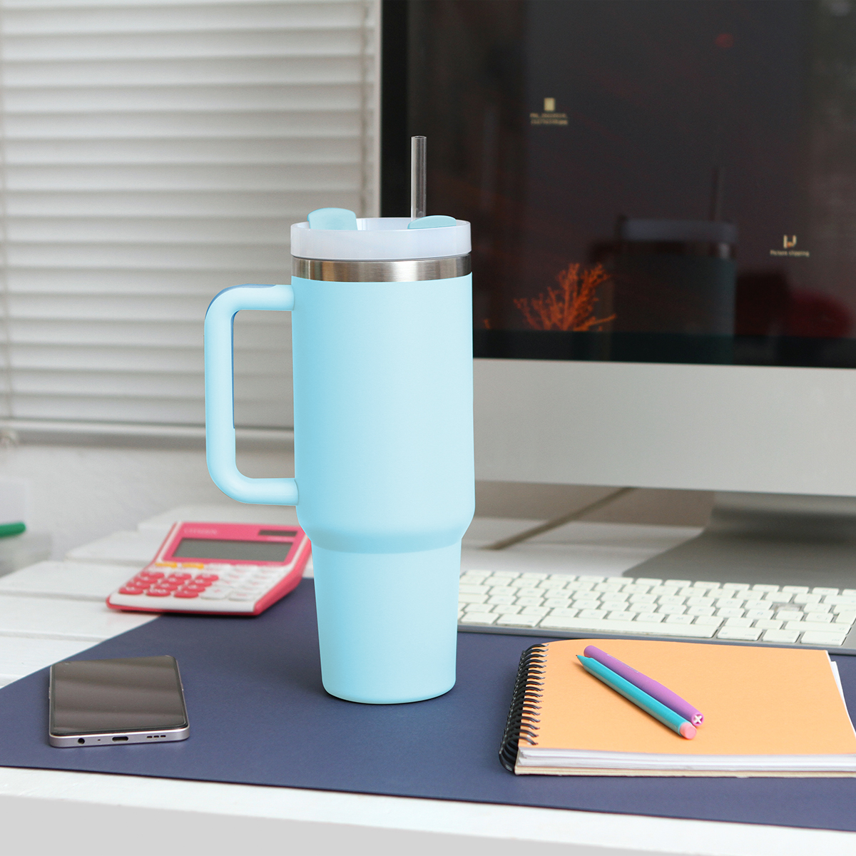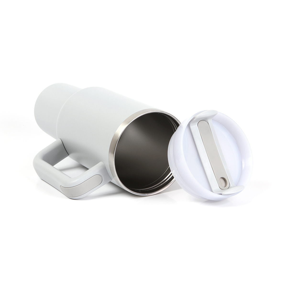 Termo Caleri. - Termo Jumbo fabricado en acero inoxidable de doble pared con asa y tapa deslizable con opción para usar con o sin popote. Cubierta giratoria con tres posiciones: apertura especial para popote que mantiene el popote reutilizable en su lugar, apertura de bebida para tomar directamente del termo y cubierta completa para cerrar el termo. Capacidad de 1,200 ml (40 oz). Incluye caja individual.