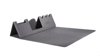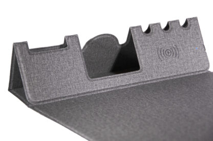MOUSE PAD MULTIFUNCIONAL CON CARGA INALÁMBRICA Mouse pad multifuncional con carga inalámbrica: plegable e impermeable, cuenta con soporte para tarjetas y teléfono, bandeja para bolígrafos, interfaz de carga y superficie de precisión para el mouse. Incluye cable tipo C.
