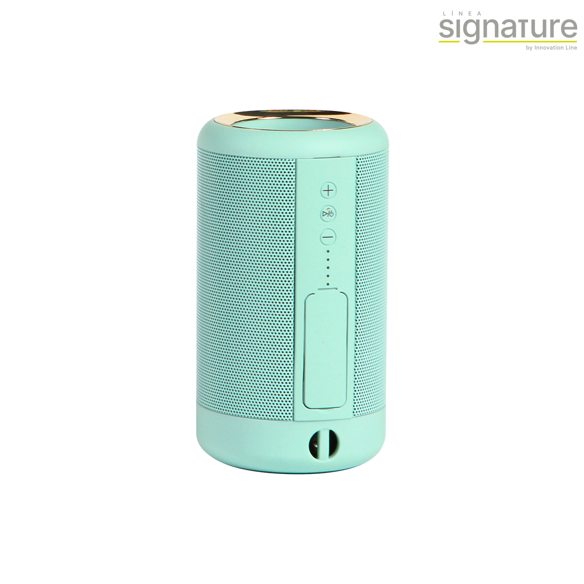 Bocina Rieti - Bocina con conexión de sonido sin cables,  power bank con capacidad de 1,200 mAh, batería integrada de iones de litio, fabricada en plástico ABS con acabado rubber (suave), con un detalle color dorado en la parte superior, con entrada protegida.