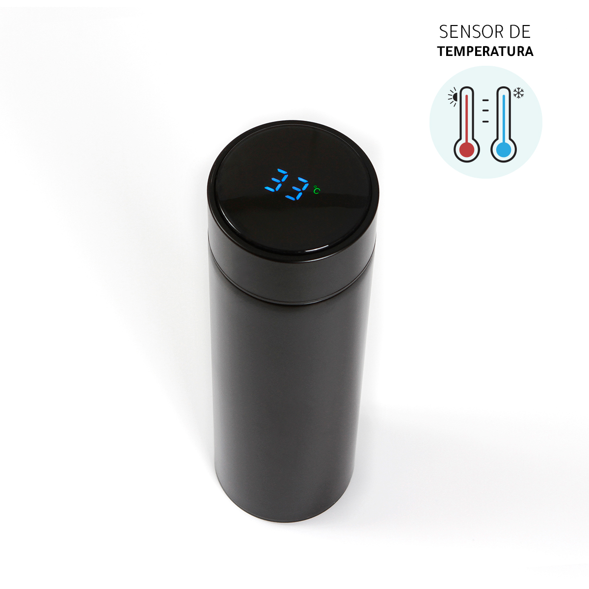 Termo con termómetro. - Termo inteligente de acero inoxidable doble pared; con pantalla LED indicadora de temperatura interior en la tapa. Fabricado en materiales de grado alimenticio, mantiene bebidas frías o calientes por un largo tiempo. La batería dura hasta 2 años. No usar en microondas. Capacidad de 500 ml. Incluye caja de cartón individual.