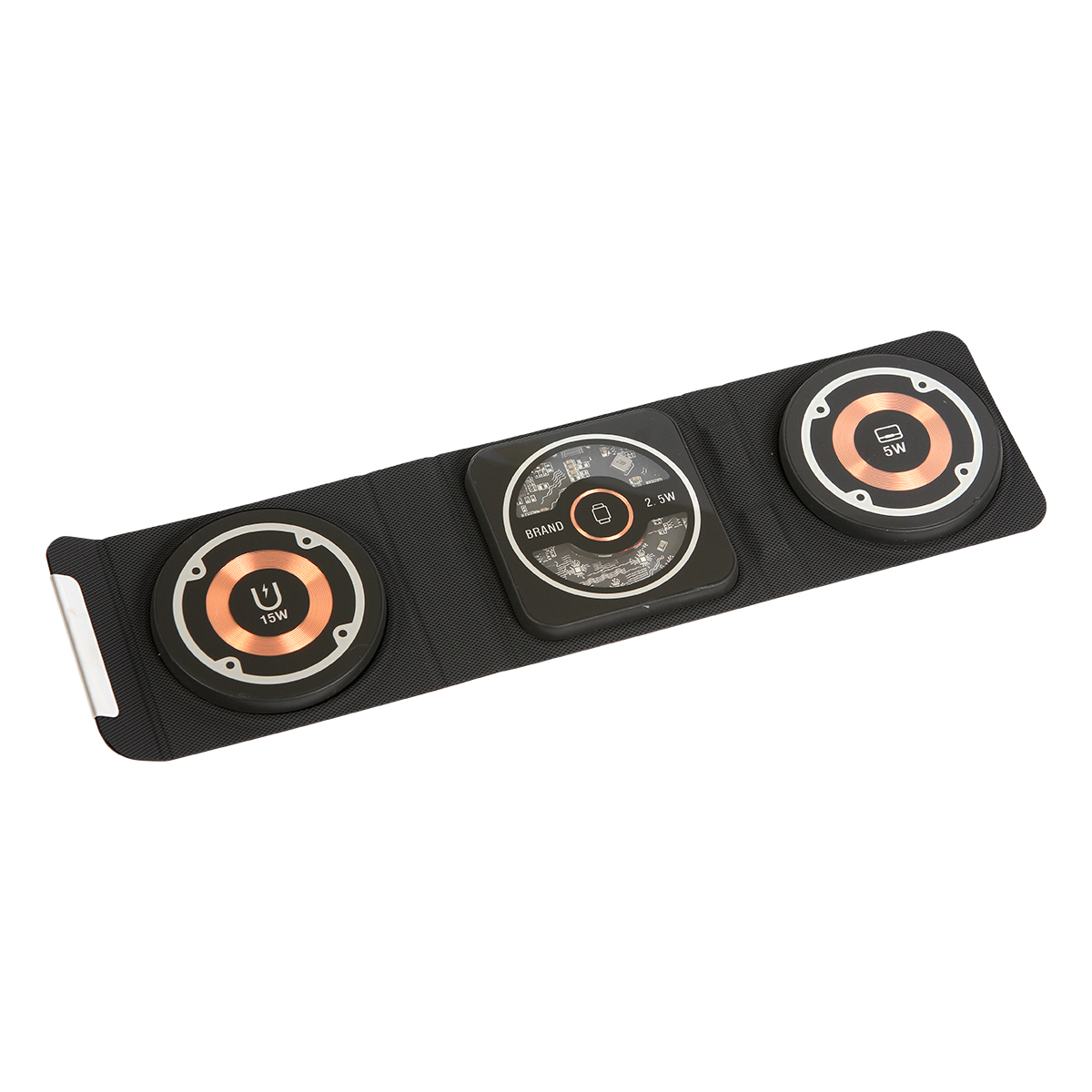 Cargador Sohar. - Cargador magnético para casa, oficina o viaje 3 en 1 plegable wireless de 15 w, material plástico ABS+PU, para celular, audífonos y reloj, carga rápida, multi función, compacto y fácil de transportar.
