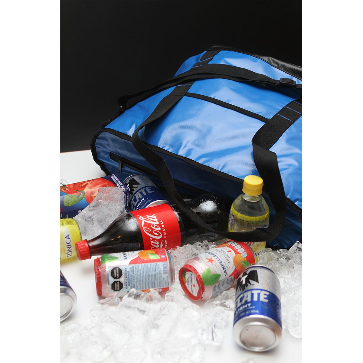 Hielera Riga. - Hielera fabricada en lona alquitranada, polietileno vinil acetato (PEVA) y espuma de polietileno (PE) de 6 mm. Con asas superiores y correa para hombro la cual es desmontable, capacidad para 24 latas (32-35 litros aproximadamente) y resistente al agua, con bolsillo frontal. Con un diseño moderno y versátil, nuestra hielera es perfecta para todas tus salidas al aire libre.