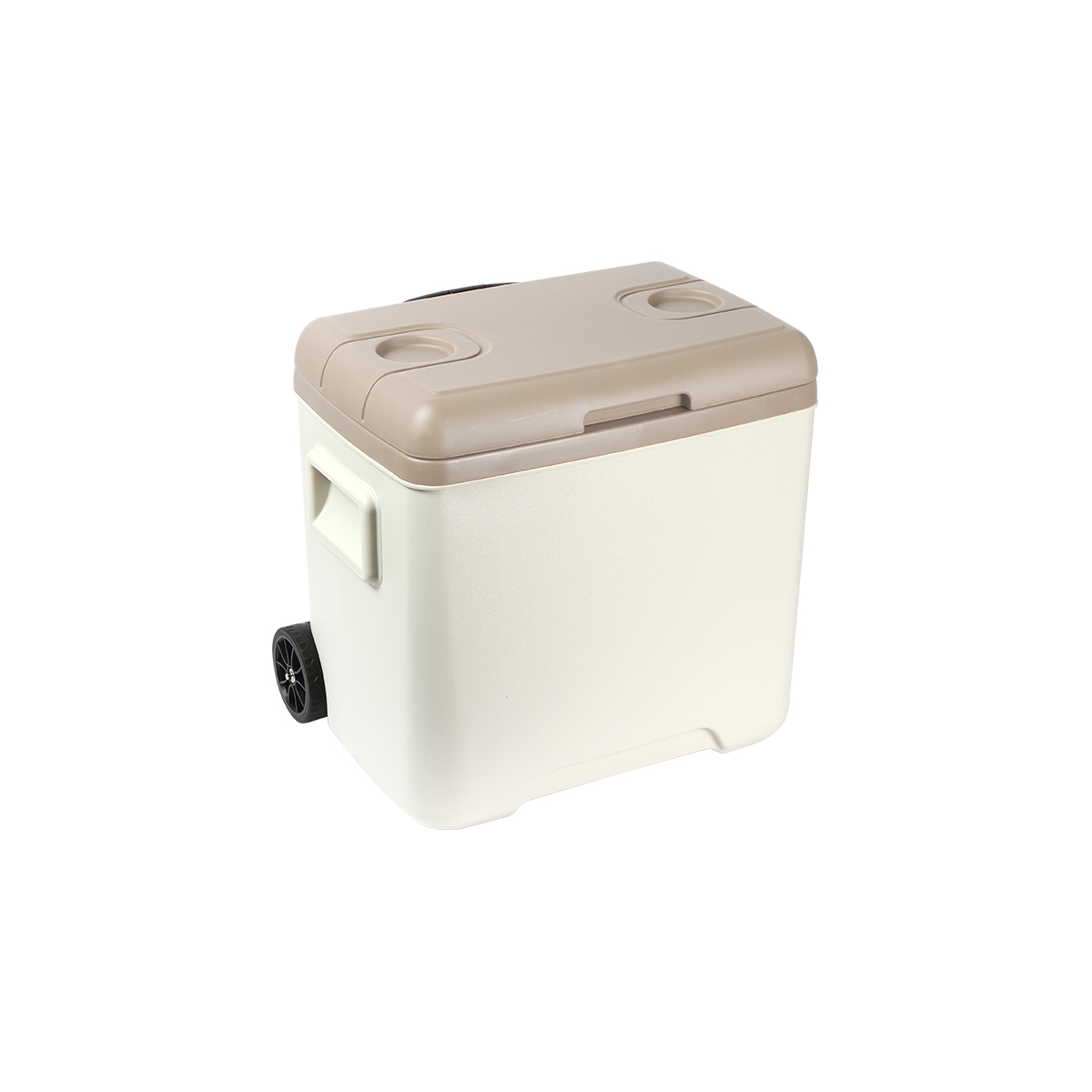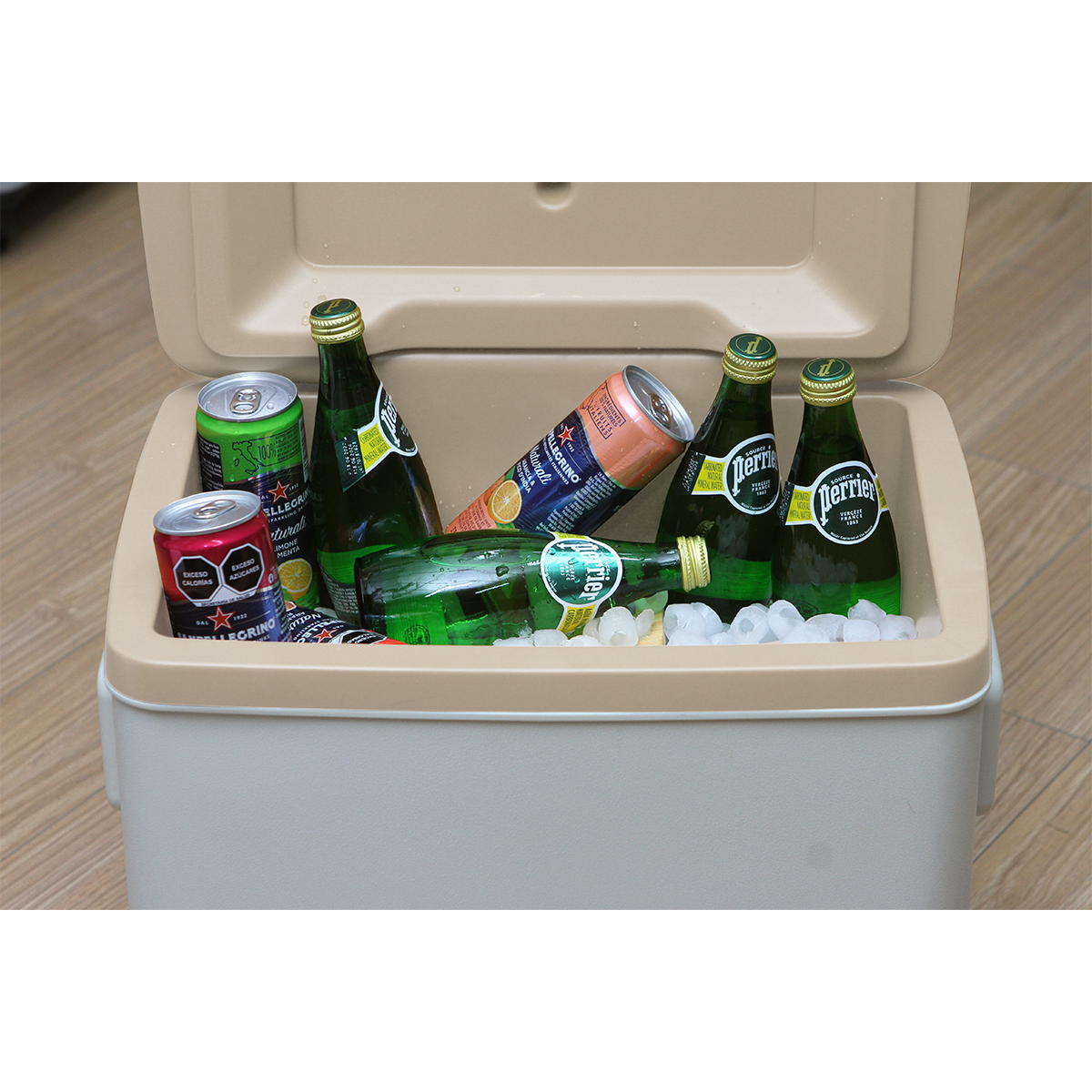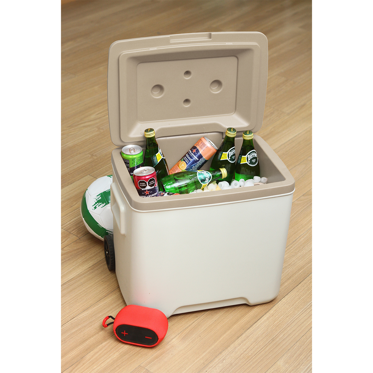 Hielera Oggau. - Hielera fabricada en poliuretano y polipropileno. Cuenta con dos llantas en la parte trasera para una mejor transportación y una agarradera desplegable. A los costados cuenta con dos agarraderas y en la tapa hay espacio para colocar las bebidas. Capacidad de 30 l.