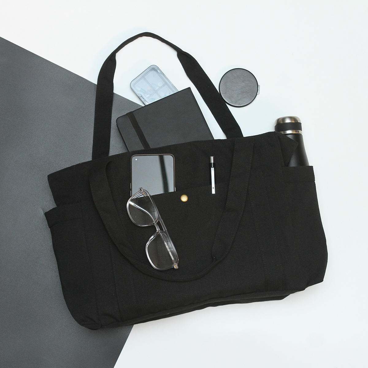 Bolsa Reit. - Bolsa tote de mano fabricada en poliéster y algodón tipo canvas. Diseño cuadrado con un compartimento principal, una bolsa frontal pequeña con broche a presión y doble asa. Tamaño ideal para llevar articulos escolares o de belleza