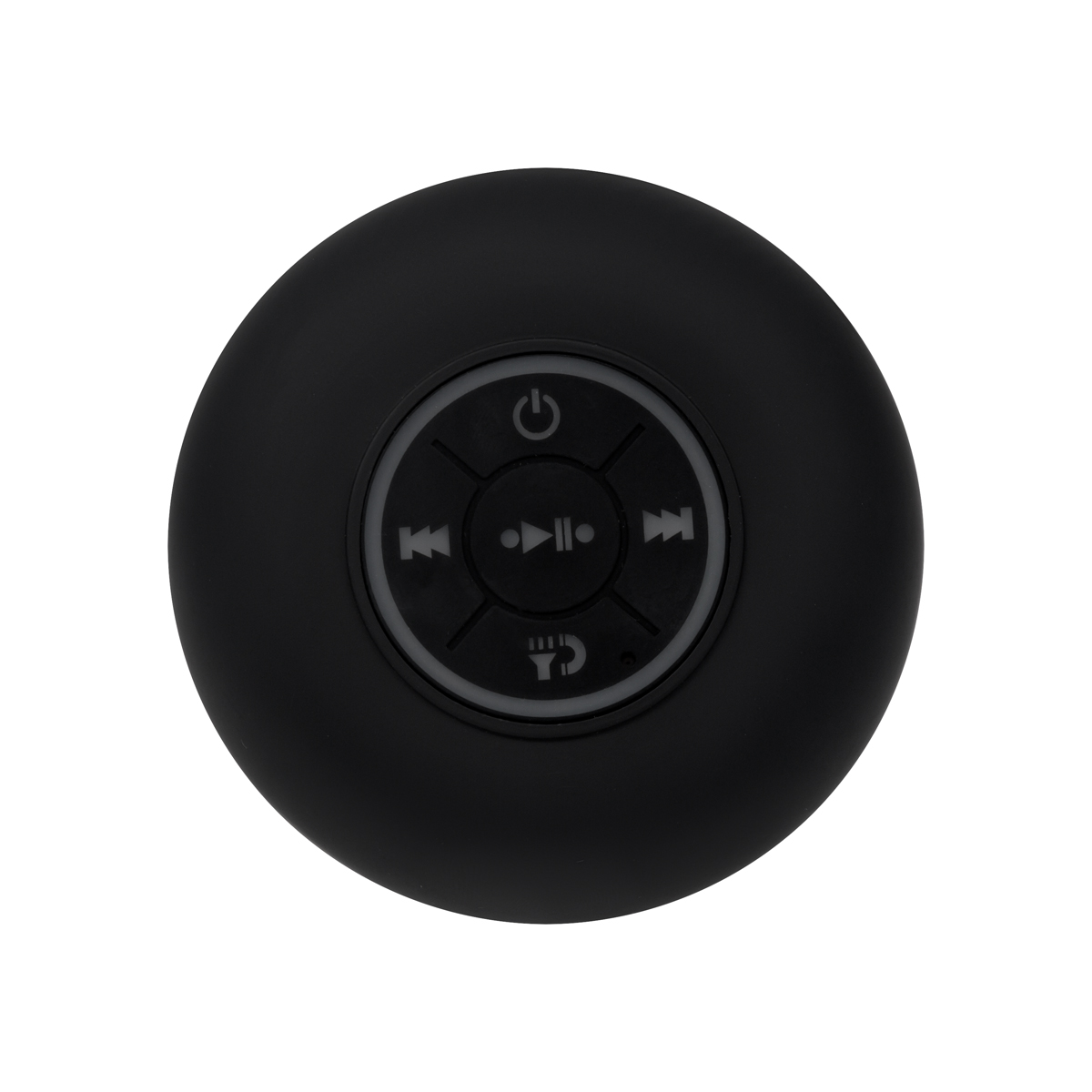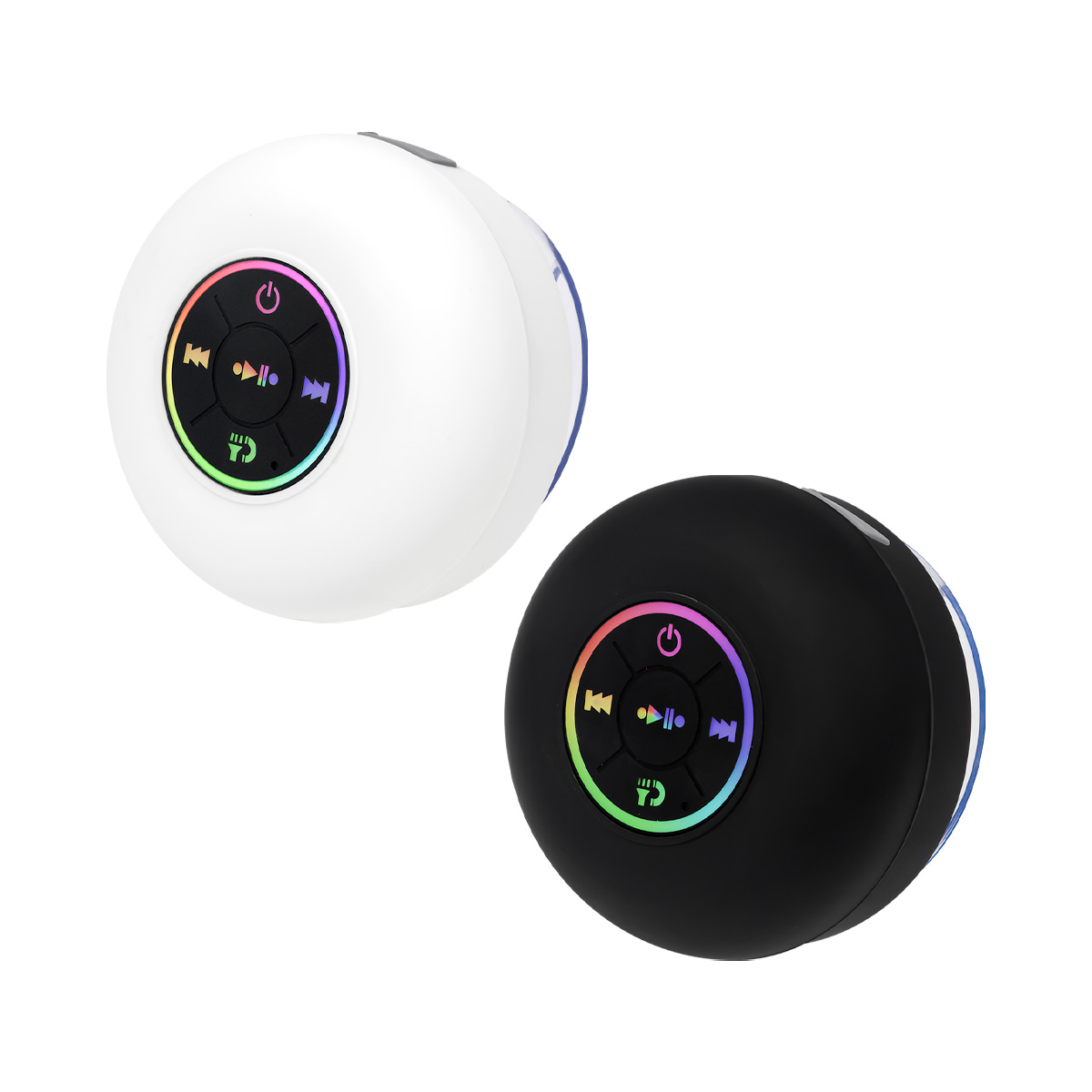 BOCINA TECHRA - Bocina bluetooth con batería recargable. Incluye luces LED con diferentes colores configurables. Resistente a salpicaduras. Ventosa de fuerte fijación para superficies lisas. Reproducción de música hasta 6 horas. Función manos libres. Controles de volumen, reproducción, micrófono y luces. Incluye cable cargador tipo C.