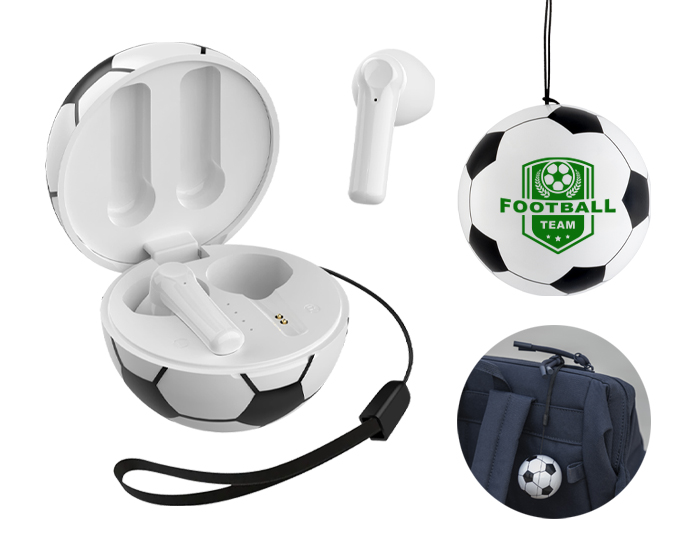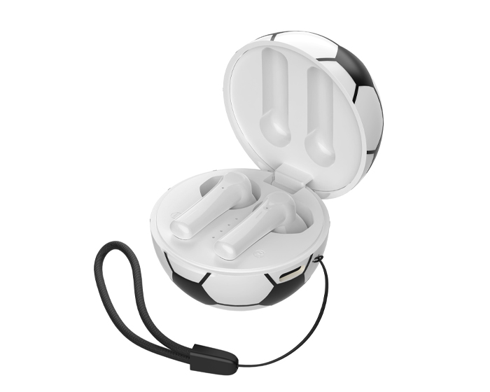 GOAL - Audífonos inalámbricos Bluetooth con estuche de carga de 220 mAh en forma de balón de fútbol soccer. Cuentan con función de manos libres, alcance de hasta 10 m, entrada tipo C (incluye cable) y correa para transporte. Duración aprox. de reproducción de 4 hrs. Tiempo de carga 2 hrs. Compatibles con dispositivos Android e iOS. Presentación: Caja a color.