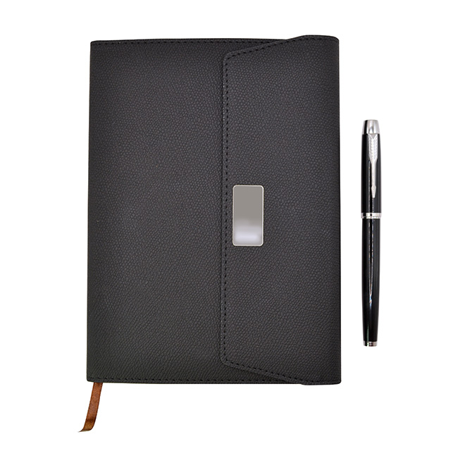 l Incluye libreta y bolígrafo en estuche de presentación. l Libreta con 80 hojas rayadas y planeador atemporal. l Cinta divisoria. l Cierre con ceja magnético y placa para personalizar. l Bolígrafo de metal con mecanismo rotativo. l Colores: Negro.