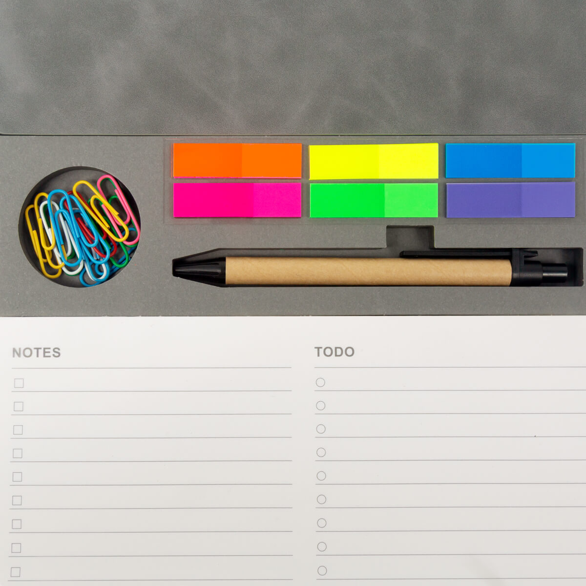 PORTA NOTAS KALEM - Porta notas de curpiel con sistema plegable que se convierte en soporte para smartphone y organizador de bolígrafos. Incluye un bolígrafo ecológico, 9 clips metálicos, block con 80 notas y banderillas adheribles de 6 colores. Ideal para mantener todo a la mano en escritorio o reuniones.