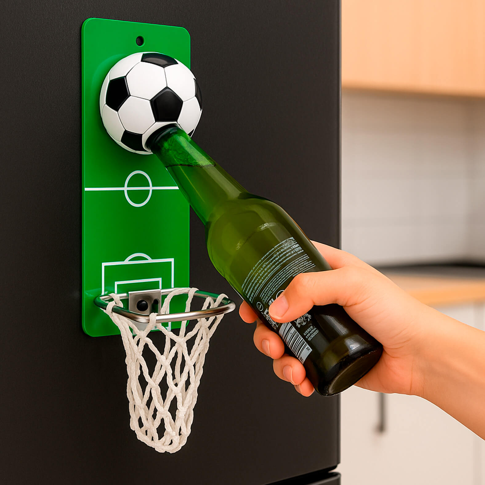 SINED Destapador con imán para refrigerador con print de cancha de futbol y red plegable para corcholata.