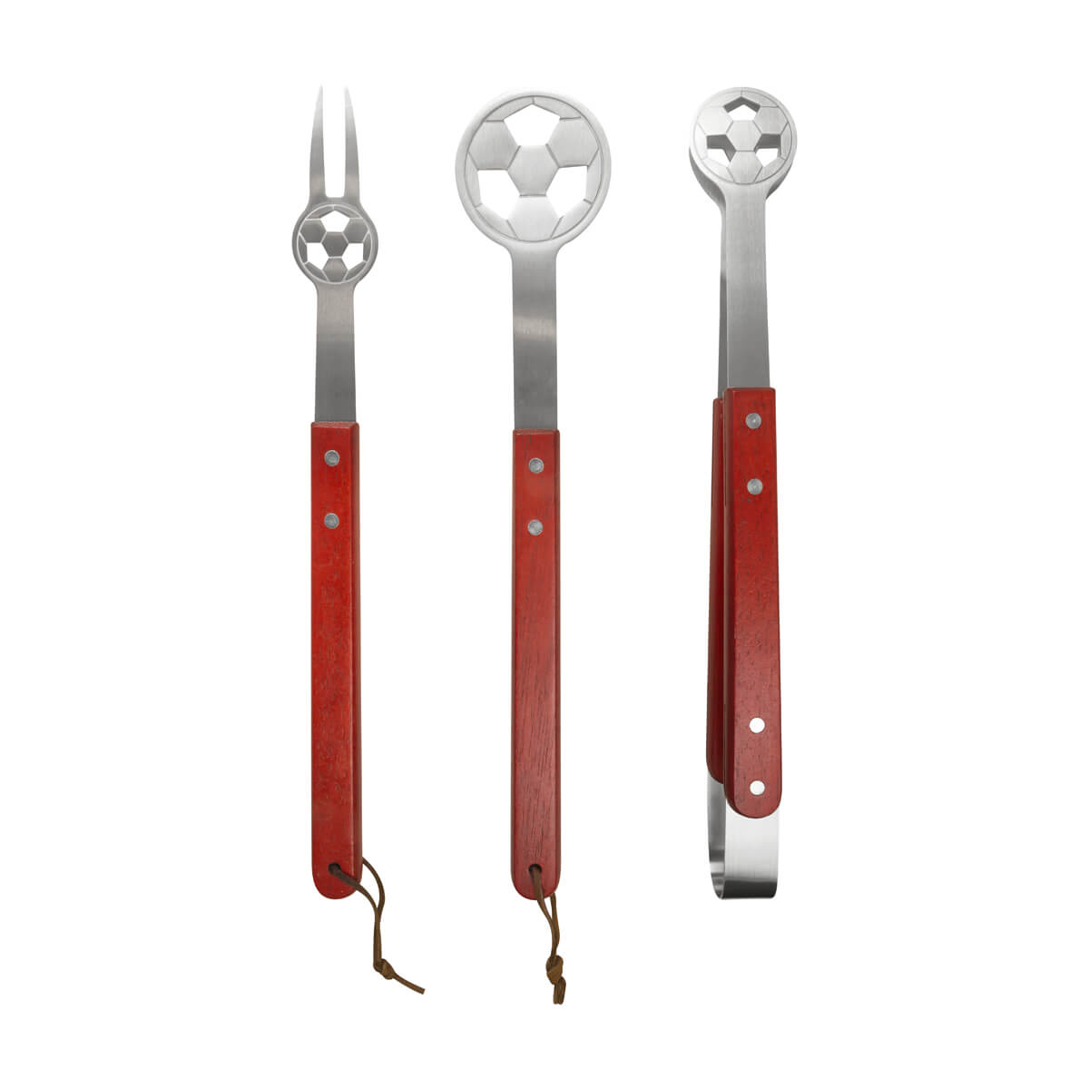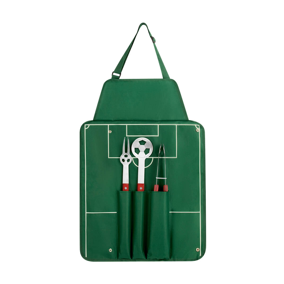 SET BBQ SOCCER - Set de BBQ en delantal con diseño de cancha de fútbol. Incluye espátula, pinzas y tenedor.