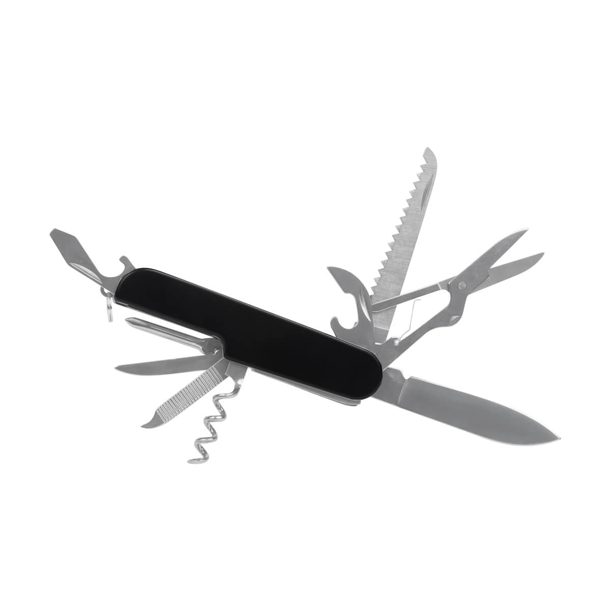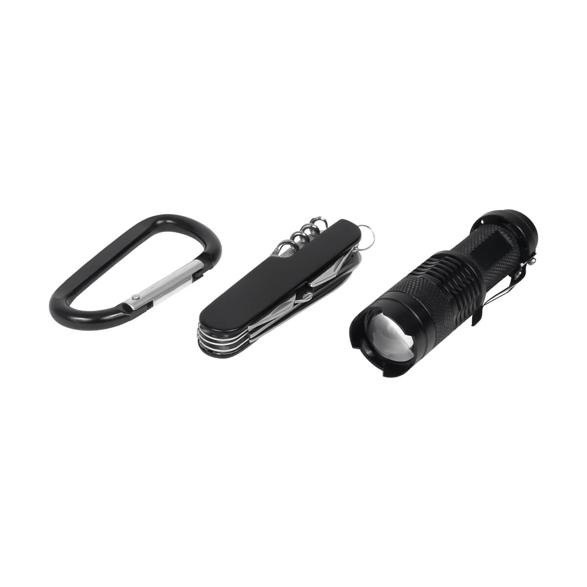 SET NERKA - Set de herramientas multiusos. Incluye gancho metálico, lámpara con luz ajustable y navaja con 9 funciones: (navaja, sierra, tijeras, destapador, abrelatas, sacacorchos, guía de hilo, lima y desarmador de cruz). Incluye caja individual.