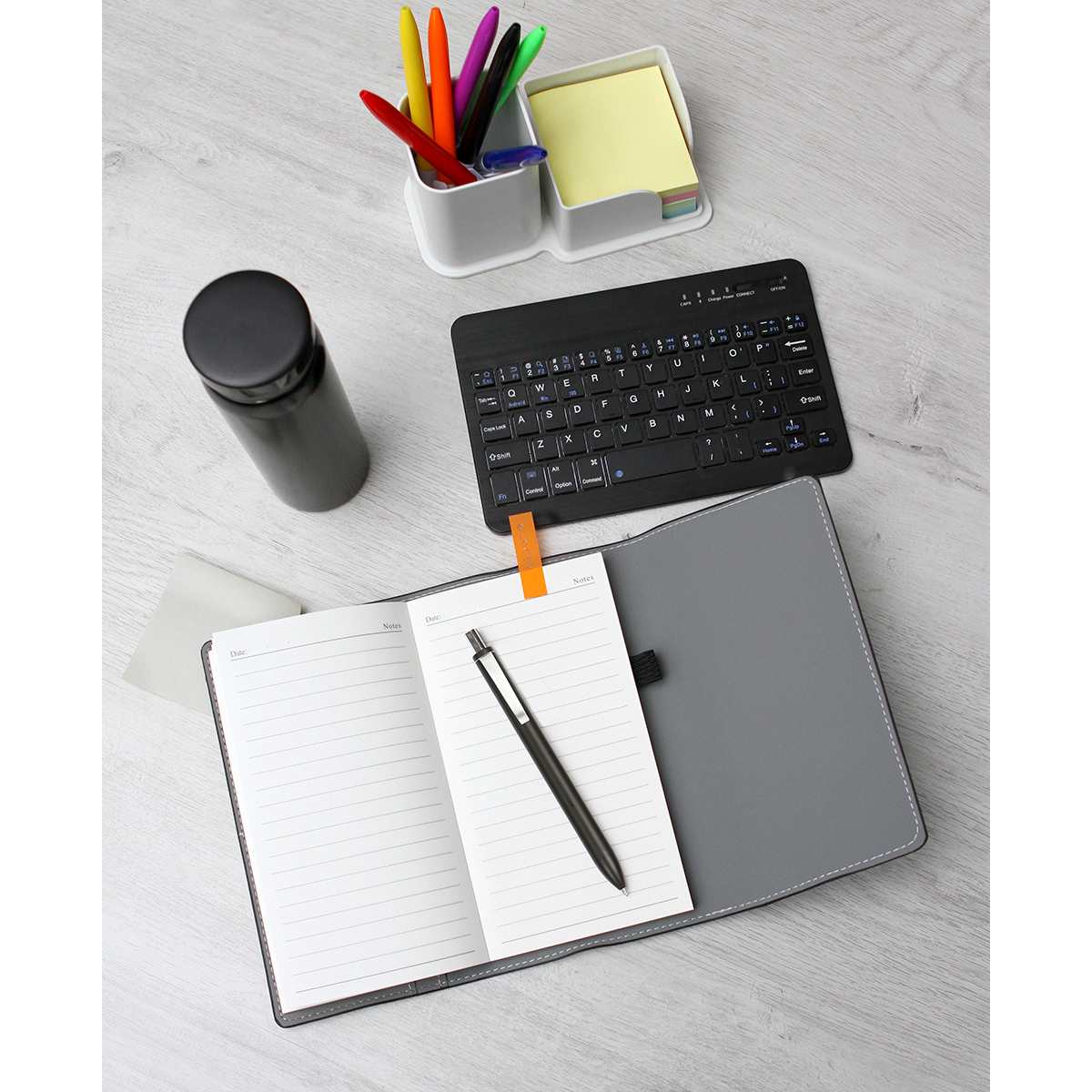 Set ejecutivo Bower. - Set ejecutivo, incluye libreta con cubierta fabricada en curpiel con 80 hojas de 70g, bolígrafo con barril plástico de apariencia metálical y termo de doble pared fabricado en acero inoxidable. Incluye caja de regalo color negro.