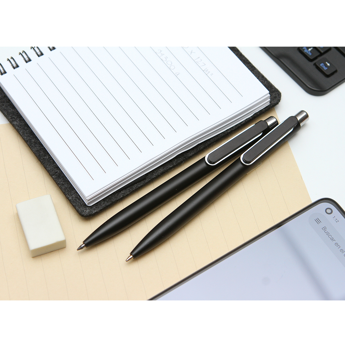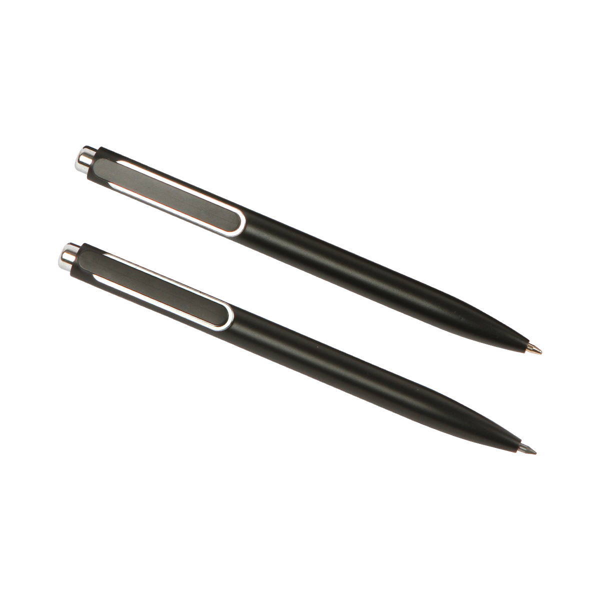 Set de bolígrafos Norwhich. - Juego de bolígrafo con tinta negra y lápiz tipo bolígrafo con punta infinita, ambos fabricados en aluminio. Elegante set de escritura que incluye una caja de presentación en papel negro. Estilo e innovación en un solo paquete.