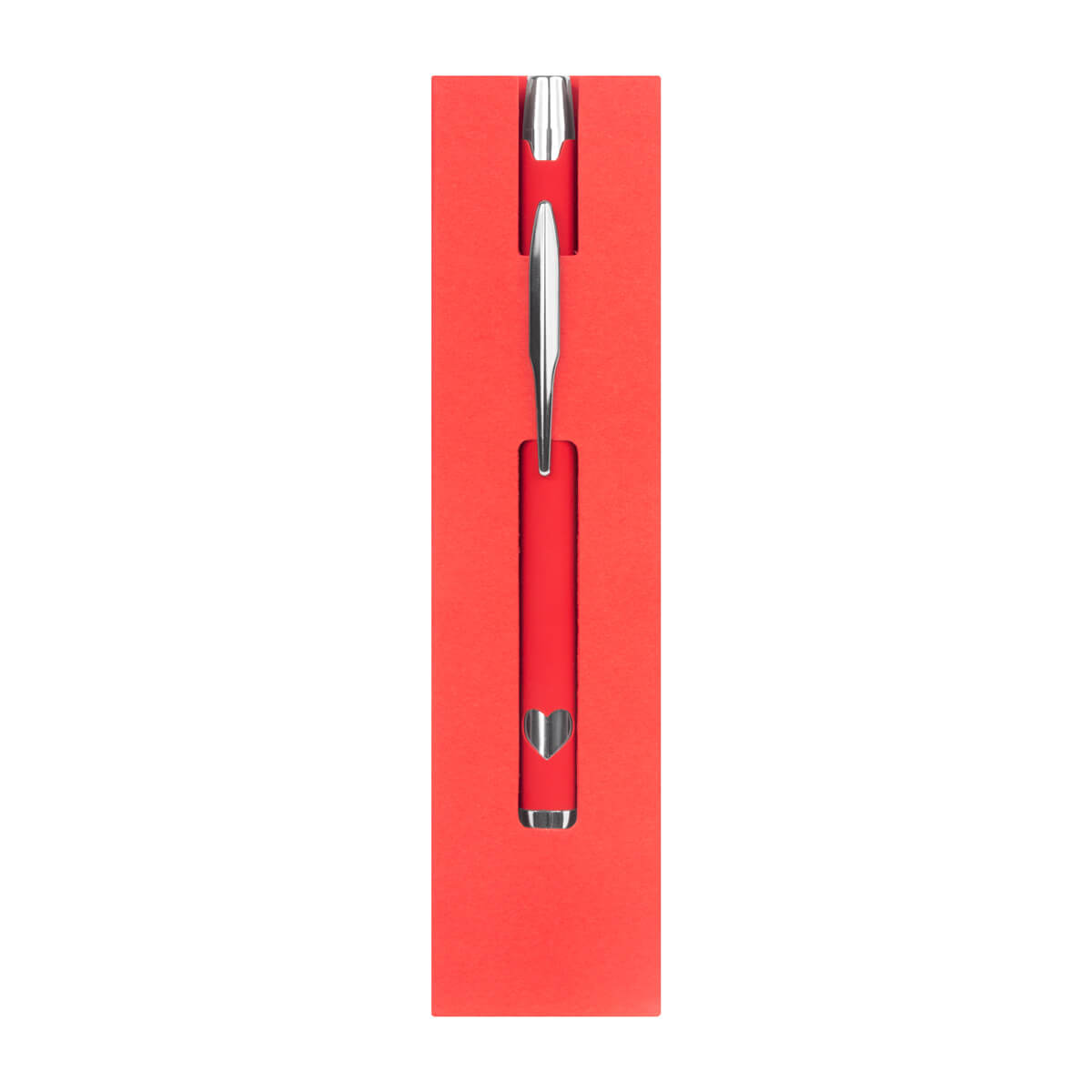 BOLÍGRAFO EROS - Bolígrafo metálico doble acabado mate en el cuerpo y detalles cromados con suaje en el cuerpo en forma de corazón. Mecanismo pulsador. Incluye funda con diseño.