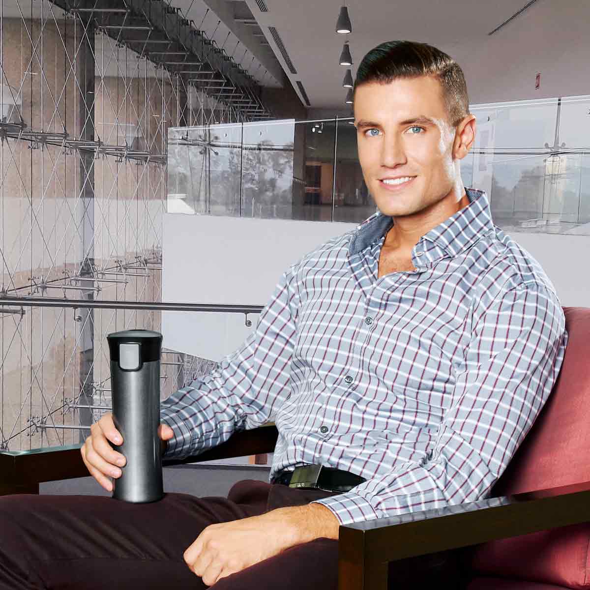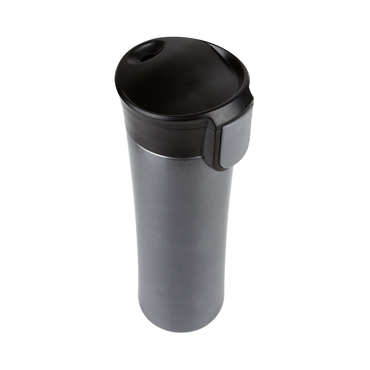 TERMO KUMASI - Doble pared. Cerrado al vacío. Pared interna y externa acero inoxidable. La tapa incluye botón pulsador para abrir y cerrar con sistema desmontable. Mantiene temperatura caliente 6 hrs y temperatura fría 8 hrs aproximadamente. Incluye caja individual.