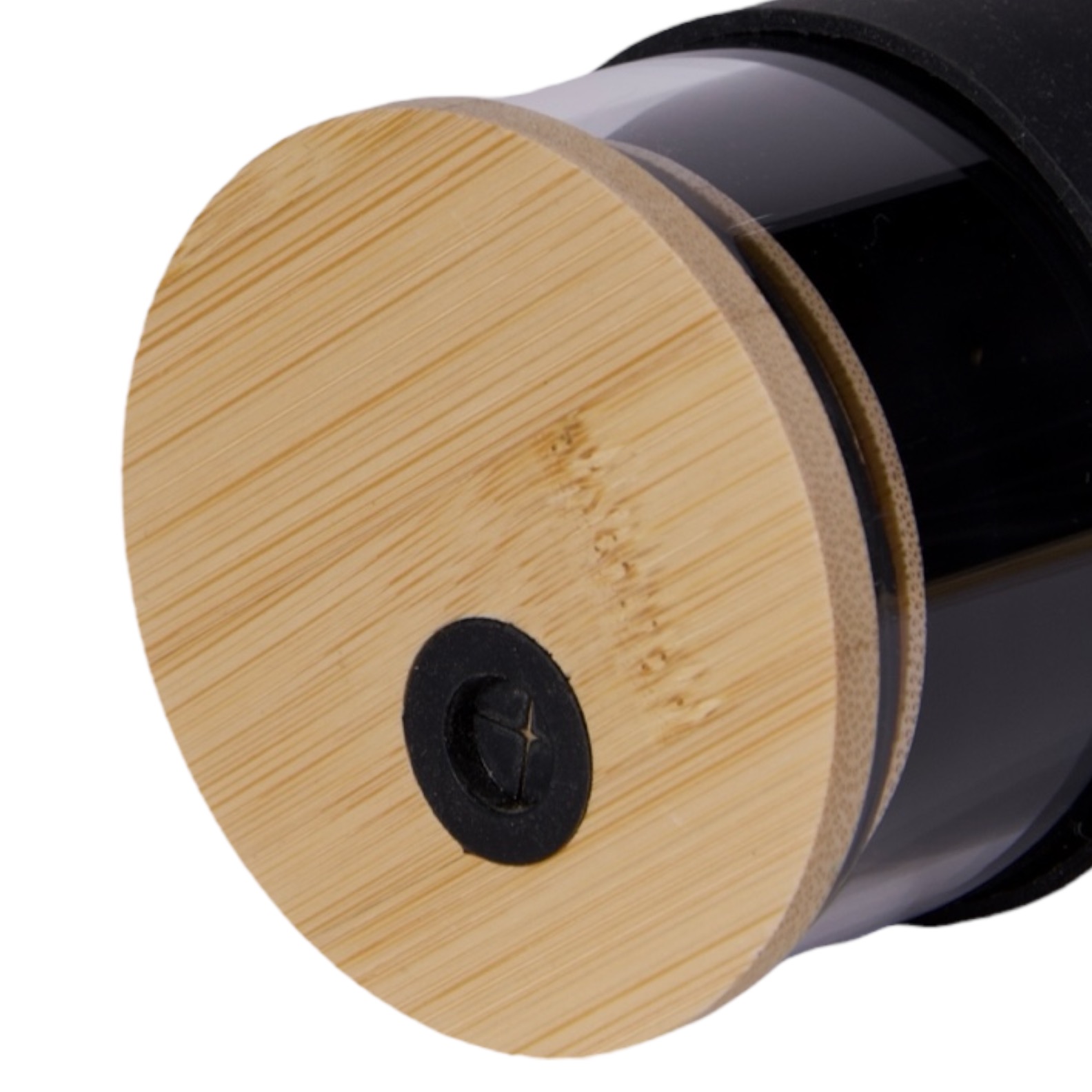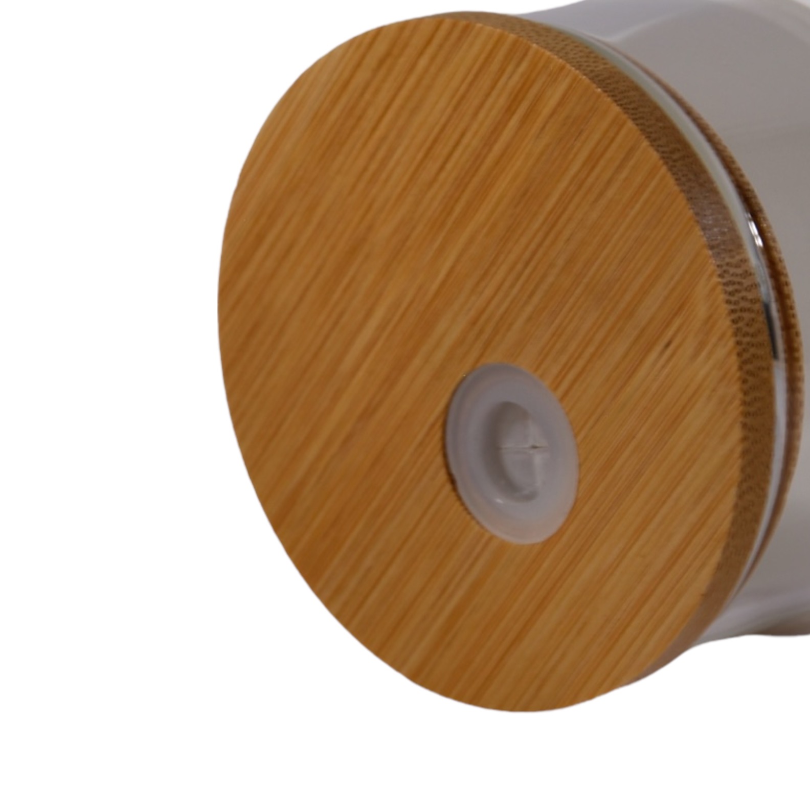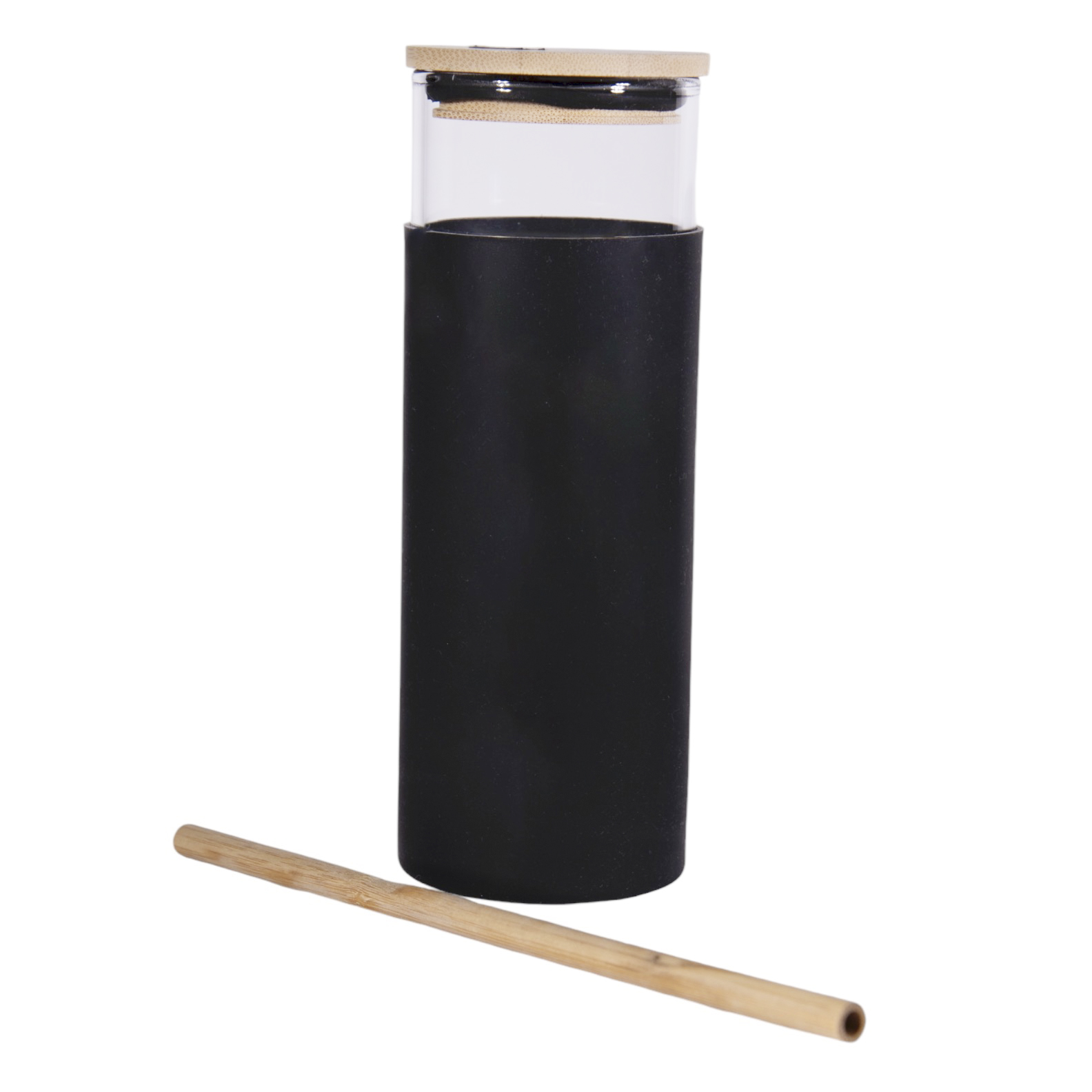 Vaso de vidrio con protector de silicona, tapa de bambú con orificio para popote.