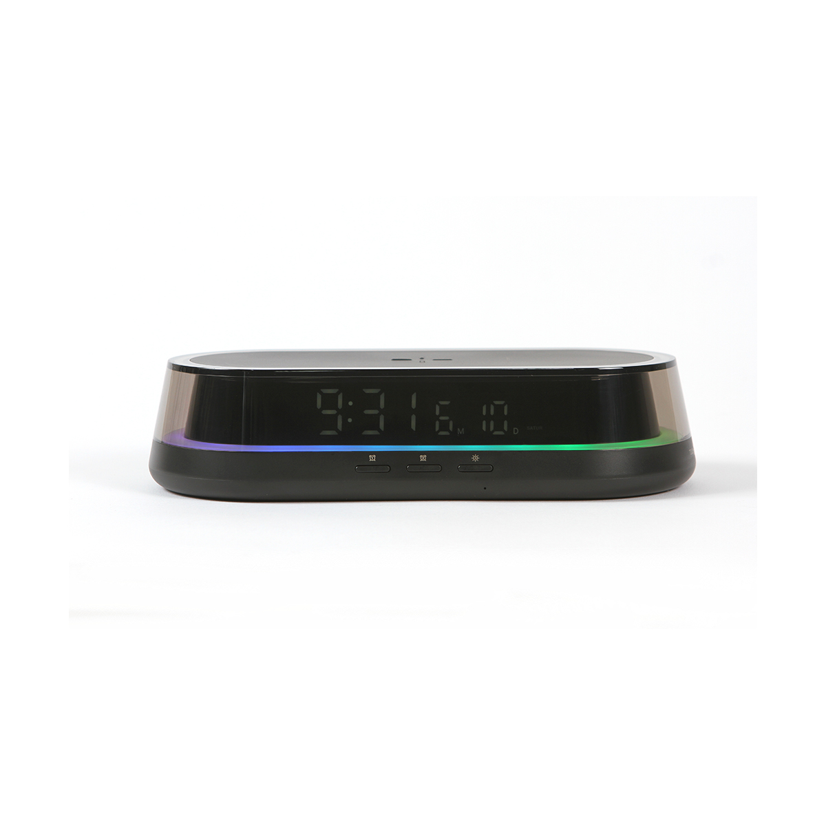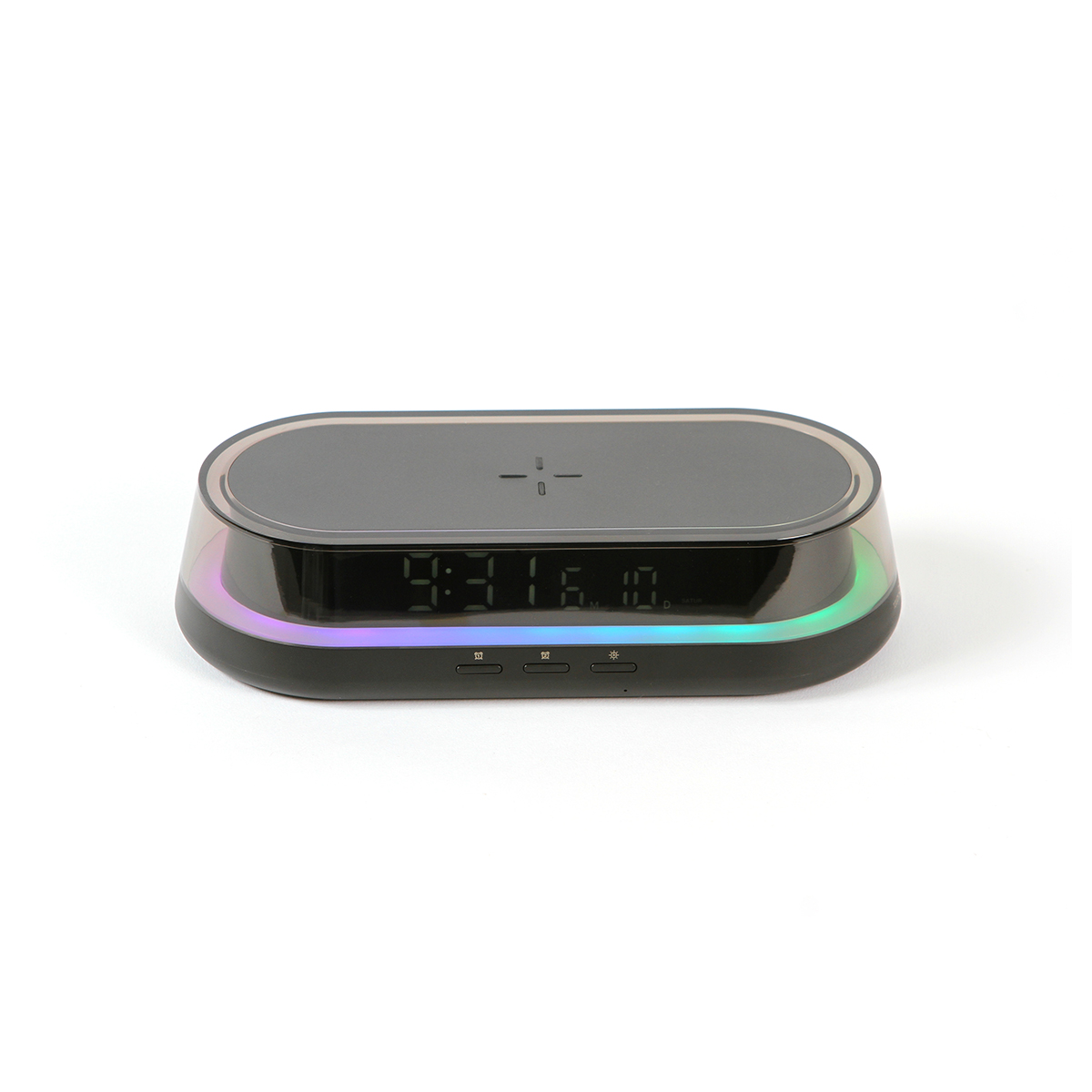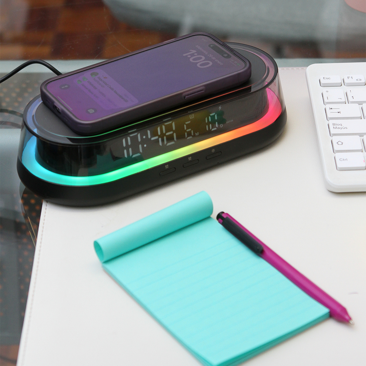 Cargador inalámbrico Bayel. - Cargador inalámbrico multifuncional para teléfono celular 15W. Con reloj y función de alarmas, incluye una lámpara de luz blanca en tres niveles y luz tipo RGB (colores). Diseño ergonómico especializado para escritorio y/o buró.