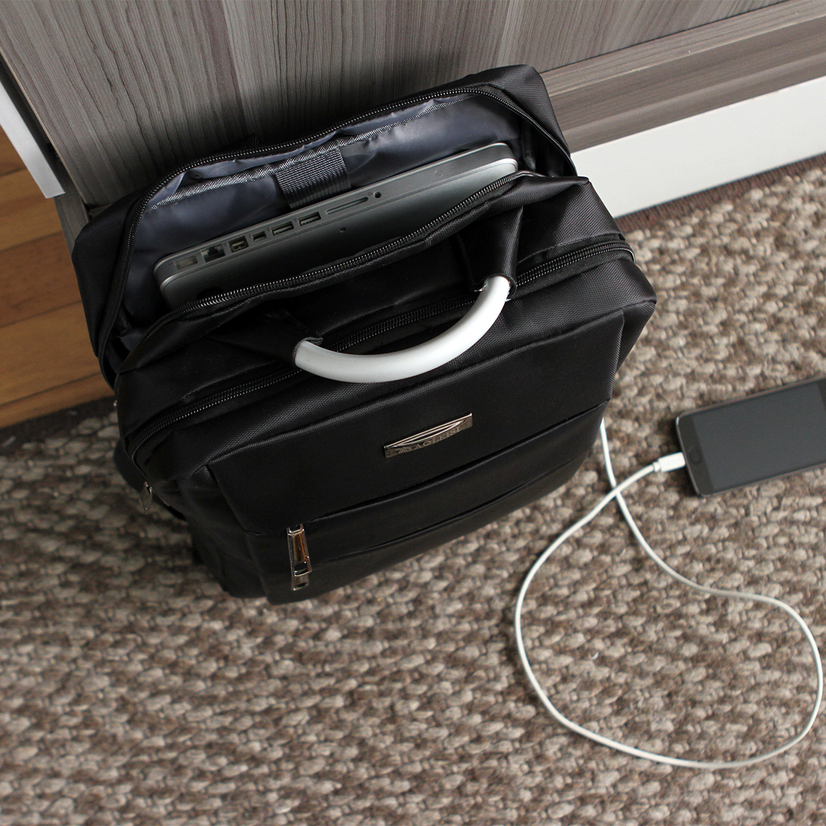 MochilaQuebec. - Mochila fabricada en poliéster con porta laptop, cable con puerto USB, múltiples compartimentos, cierres al frente, asa metálica y placa de metal al frente.