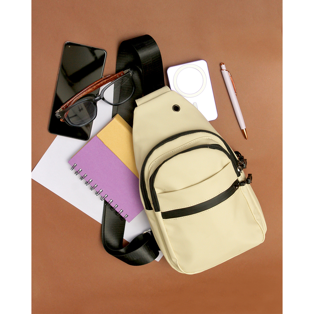 Mochila Sumbe. - Mochila crossbody fabricada en curpiel, con forro de nailon. Cuenta con correa ajustable. Incluye tres compartimentos con cierre.